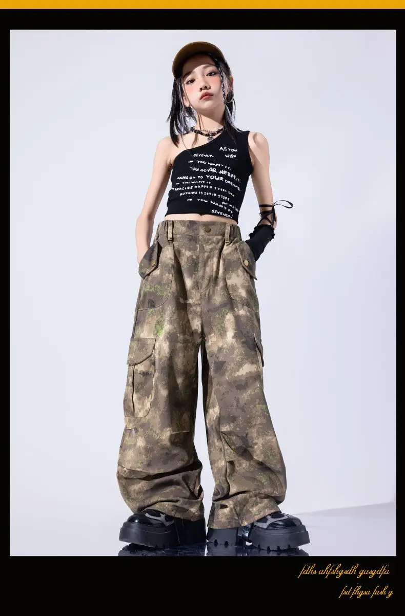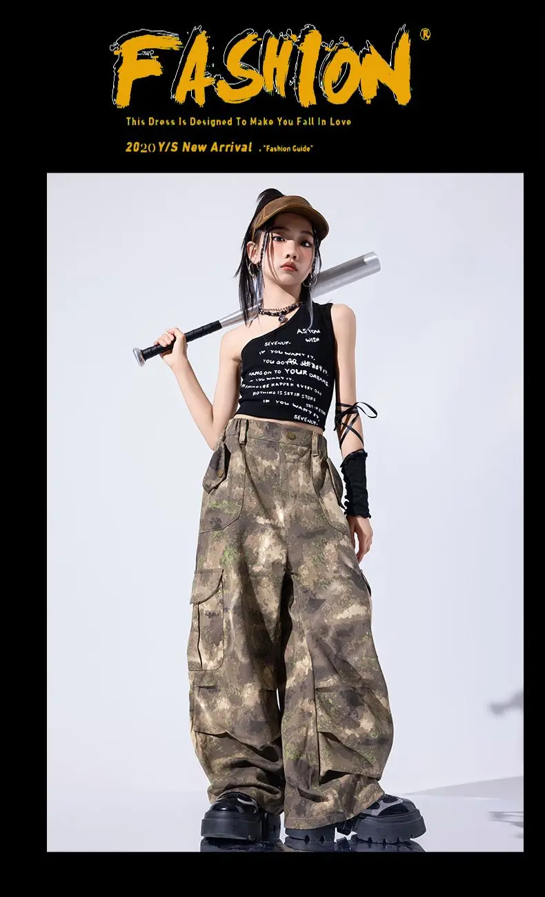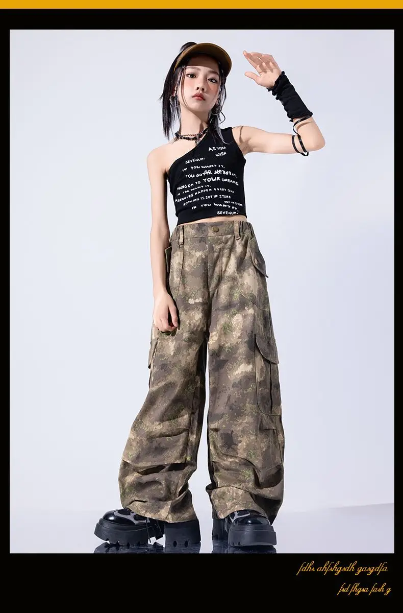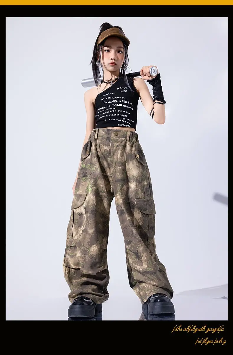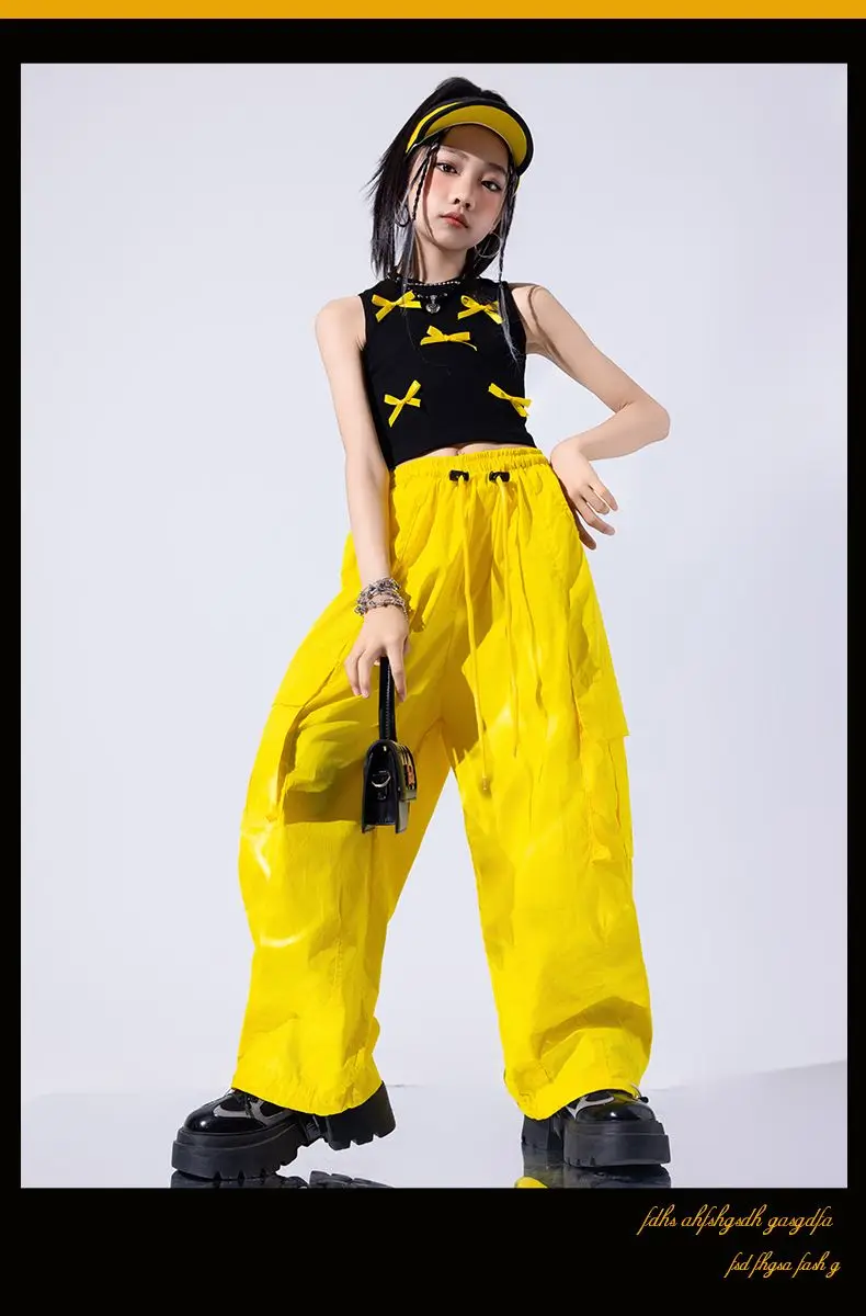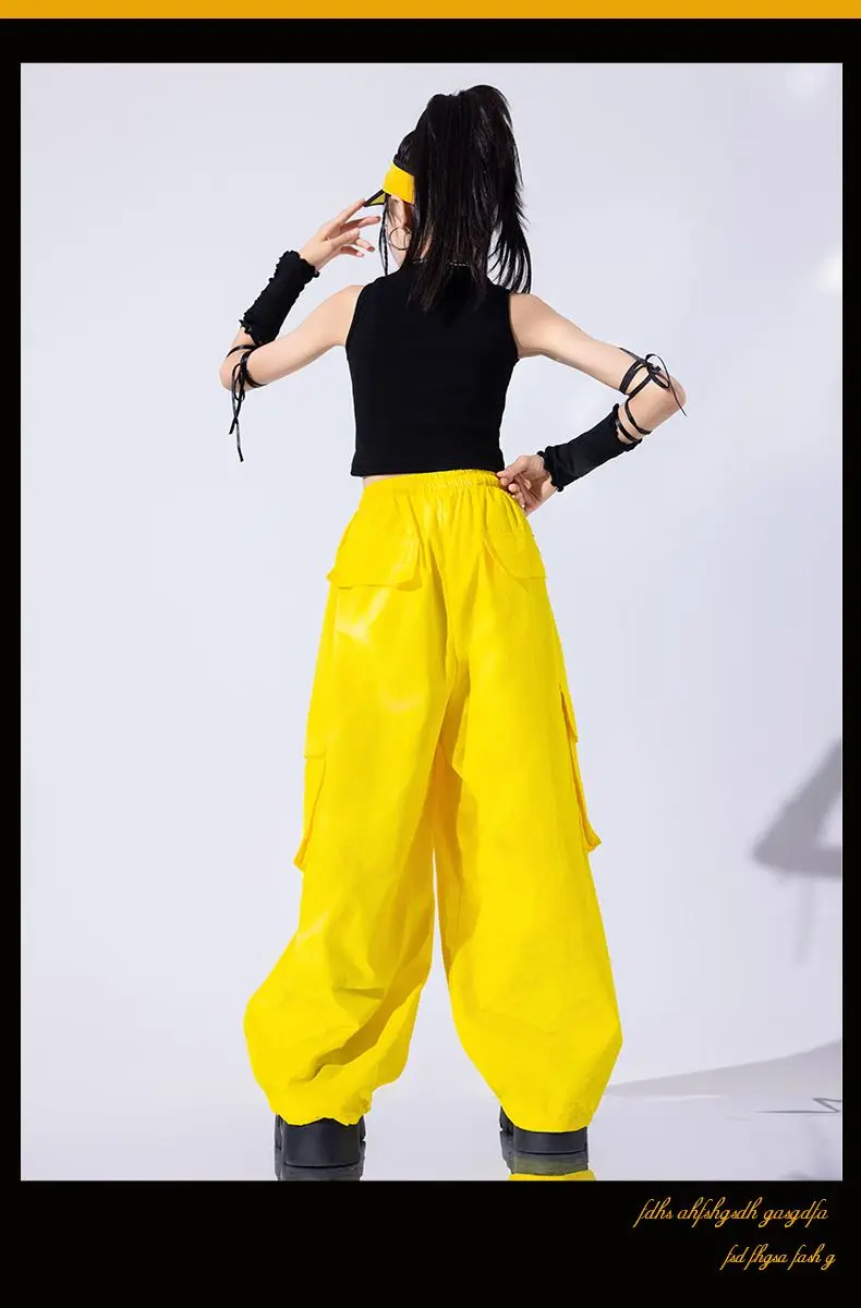 Children Jazz Modern Dance Costumes For Girls Black Vest Yellow Cargo Pants Drum Sets Kids Hip Hop Dance Stage Clothes