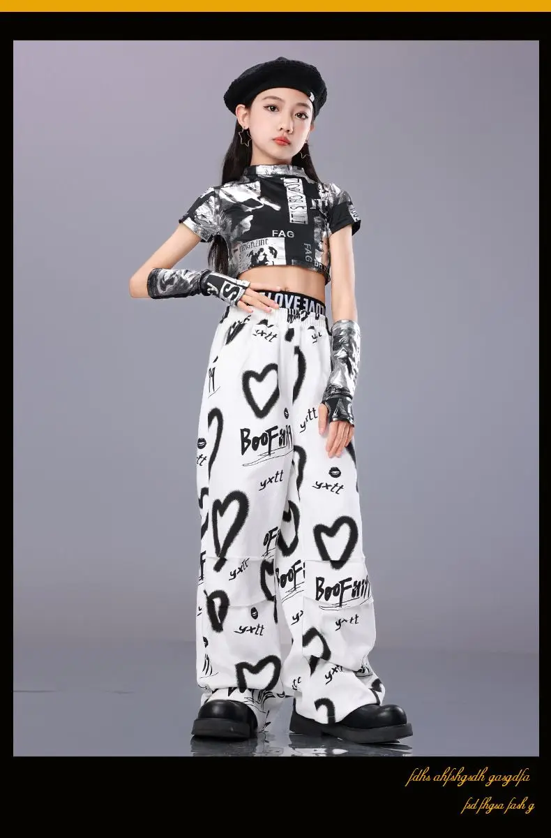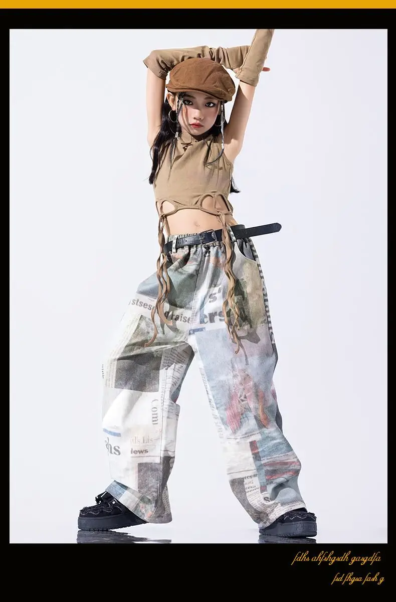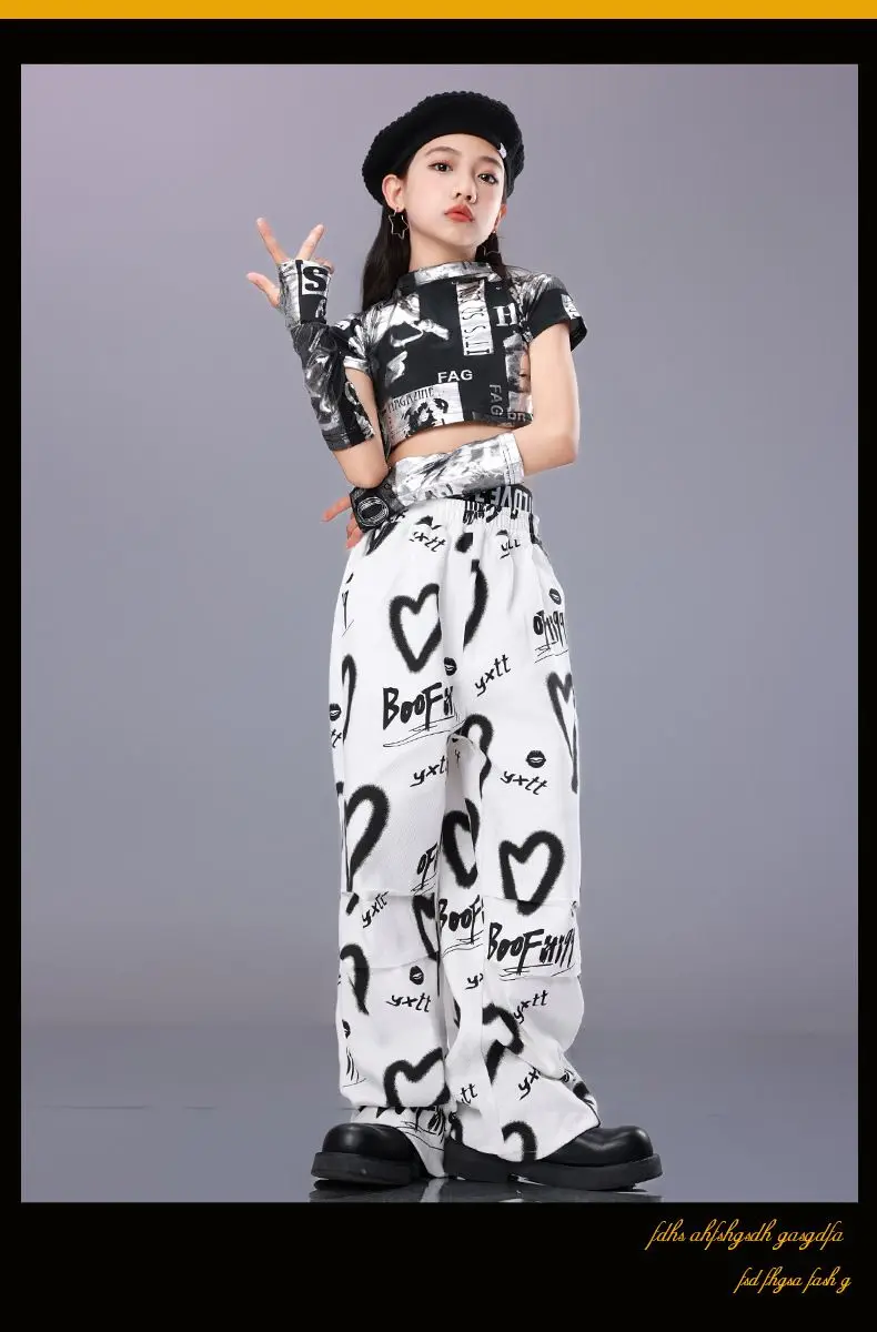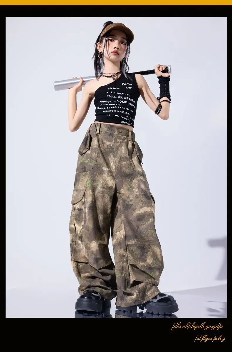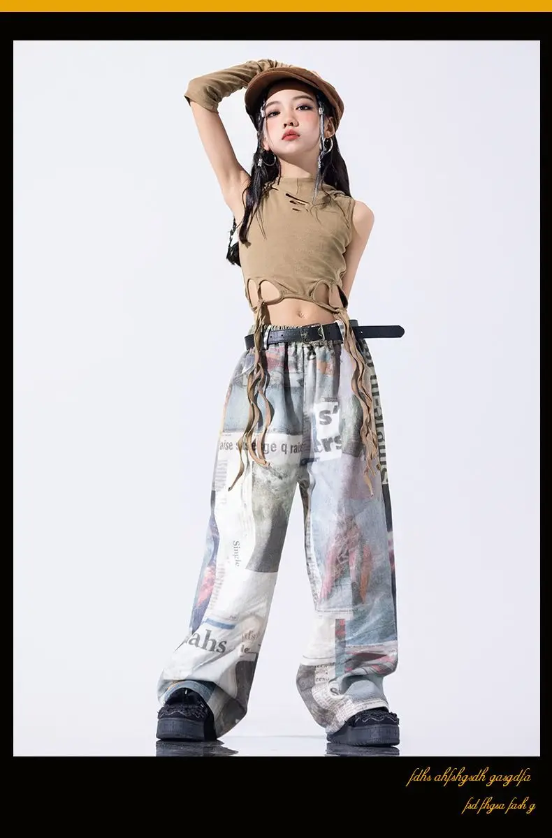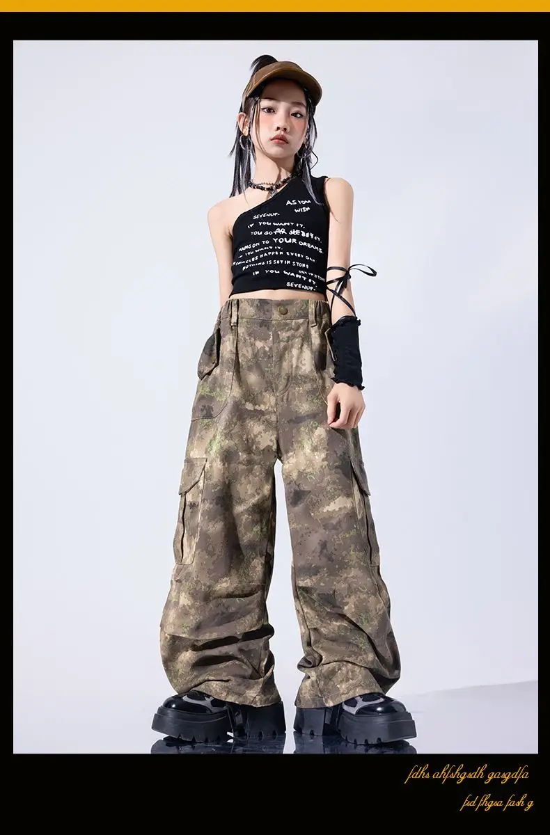 Children Jazz Modern Dance Costumes For Girls Black Vest Yellow Cargo Pants Drum Sets Kids Hip Hop Dance Stage Clothes