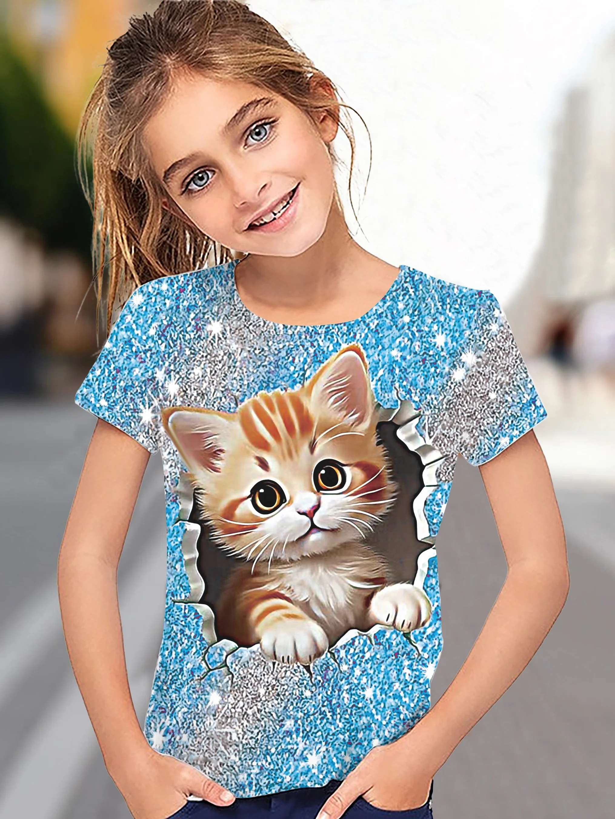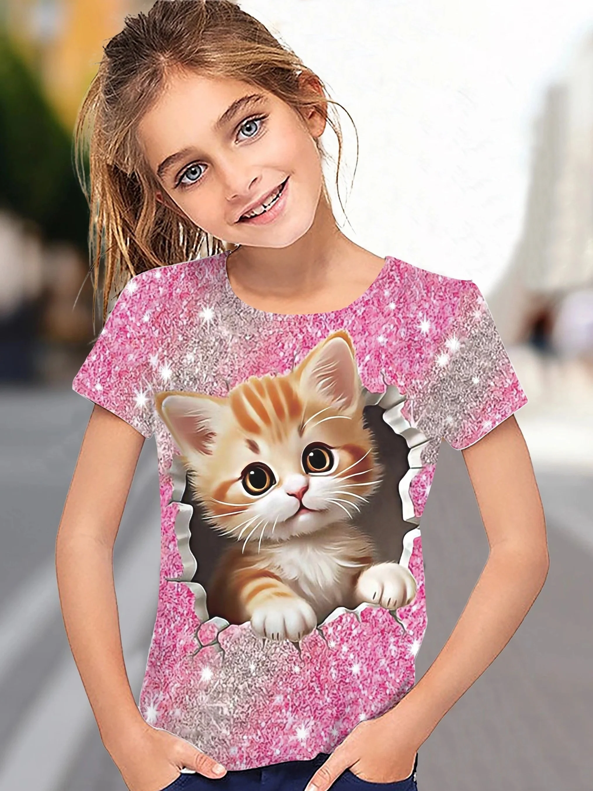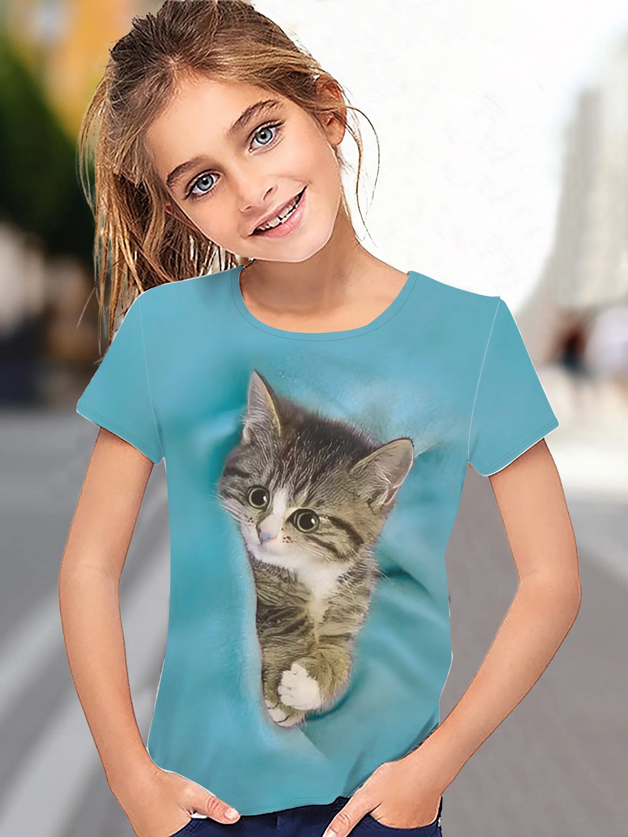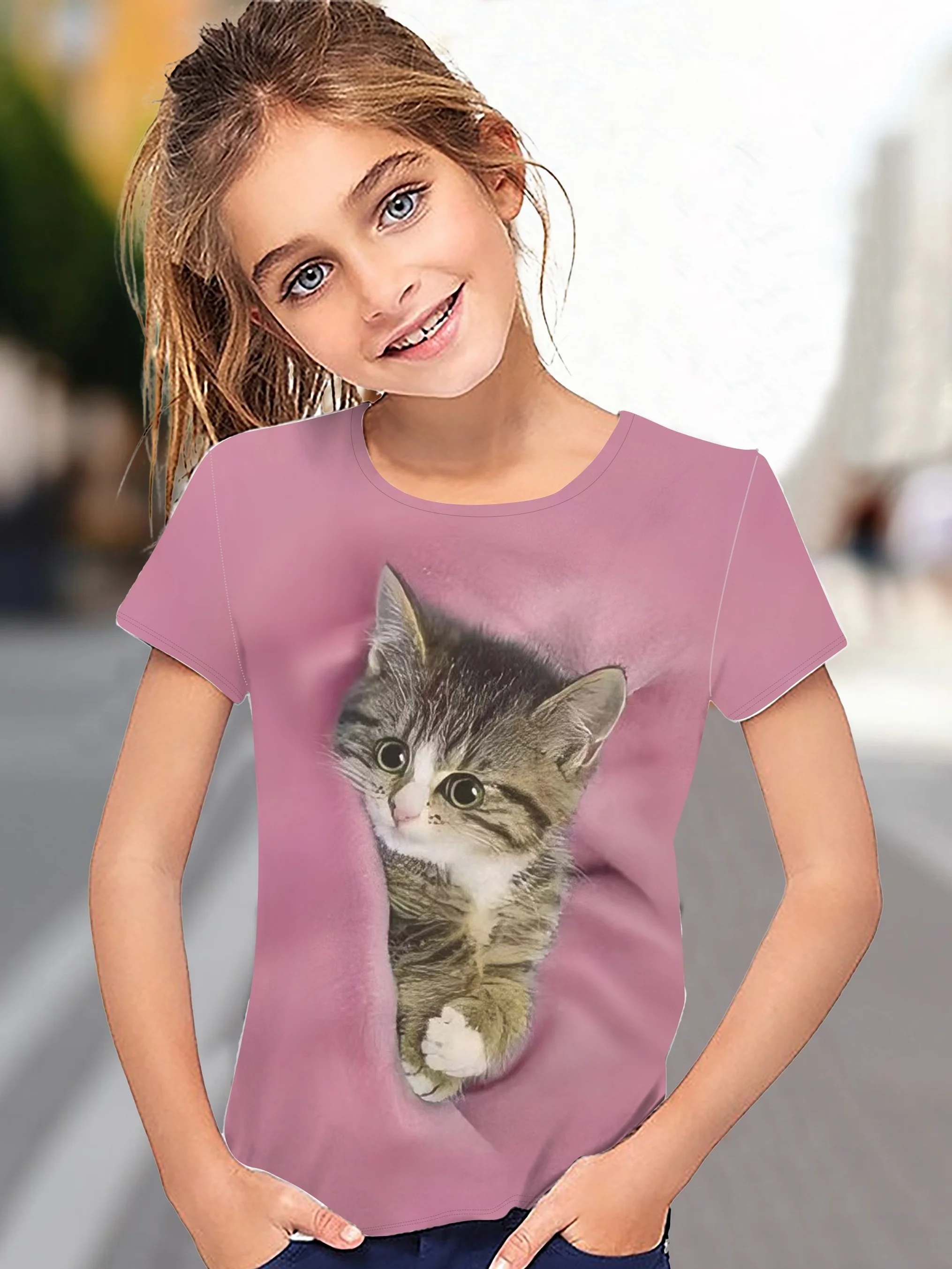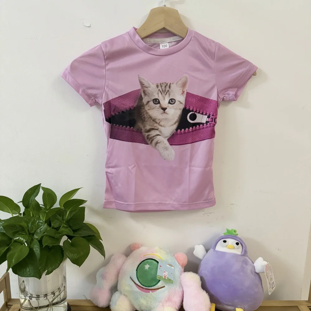 Children’s Clothing Girl T-Shirt Short Sleeve 3D Cartoon Cat Print Kids Summer Clothes Fashion Cute Girl Clothes Polyester Tops