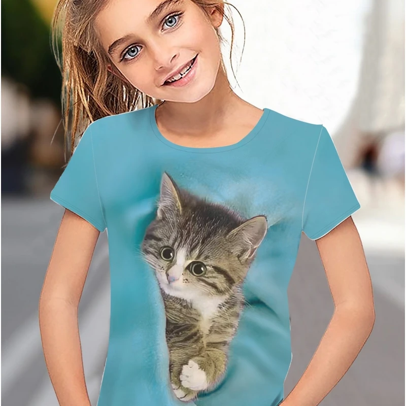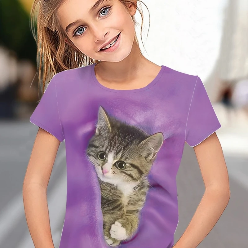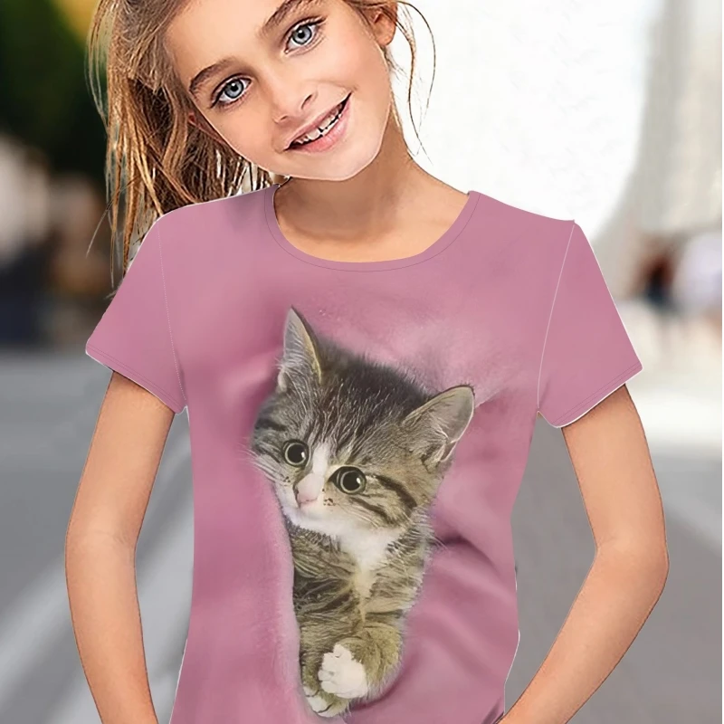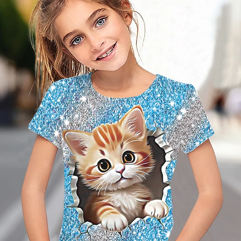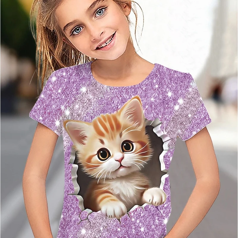 Children’s Clothing Girl T-Shirt Short Sleeve 3D Cartoon Cat Print Kids Summer Clothes Fashion Cute Girl Clothes Polyester Tops