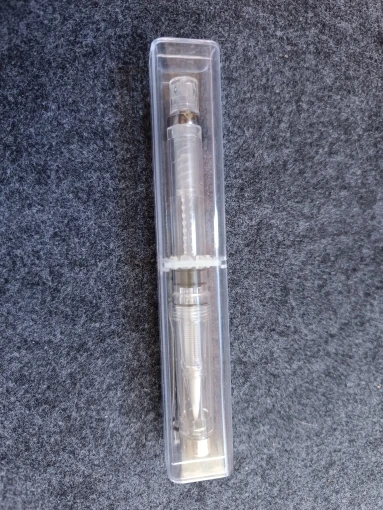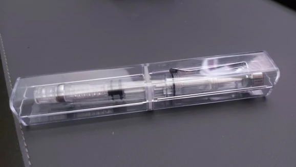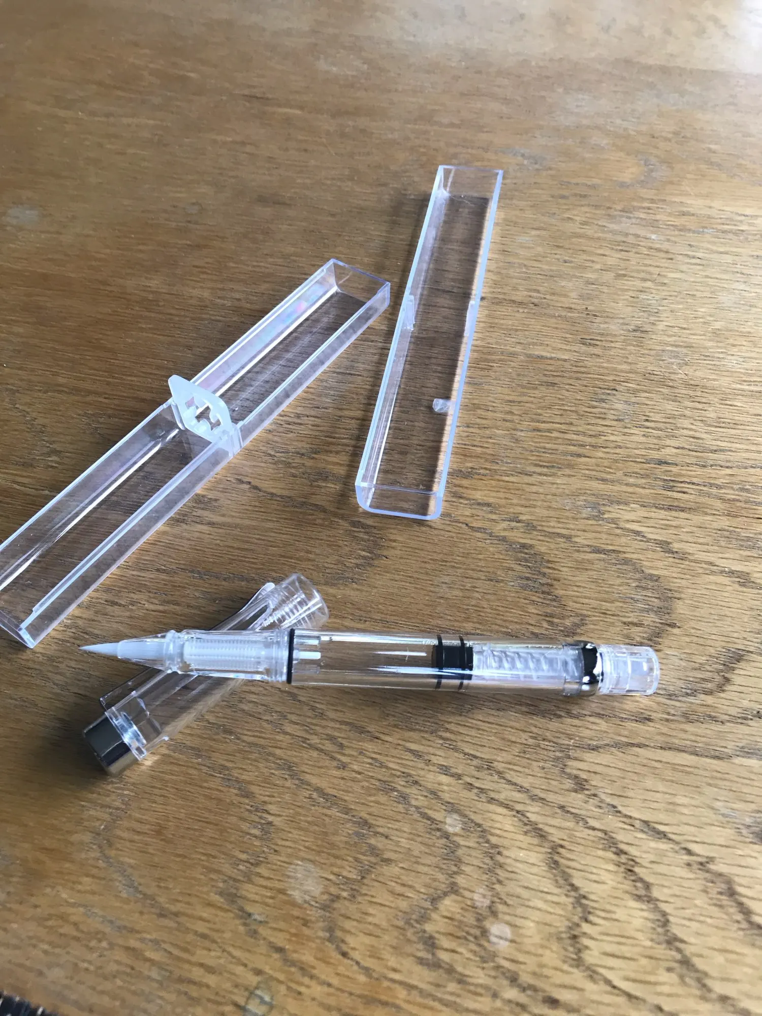 A nicely made ink brush. Winding fill chamber for ink. The tip is synthetic bristle with a fine point. Comes in a hard acrylic case which pleases me. Any leakage will be contained although i do not think the pen will leak.