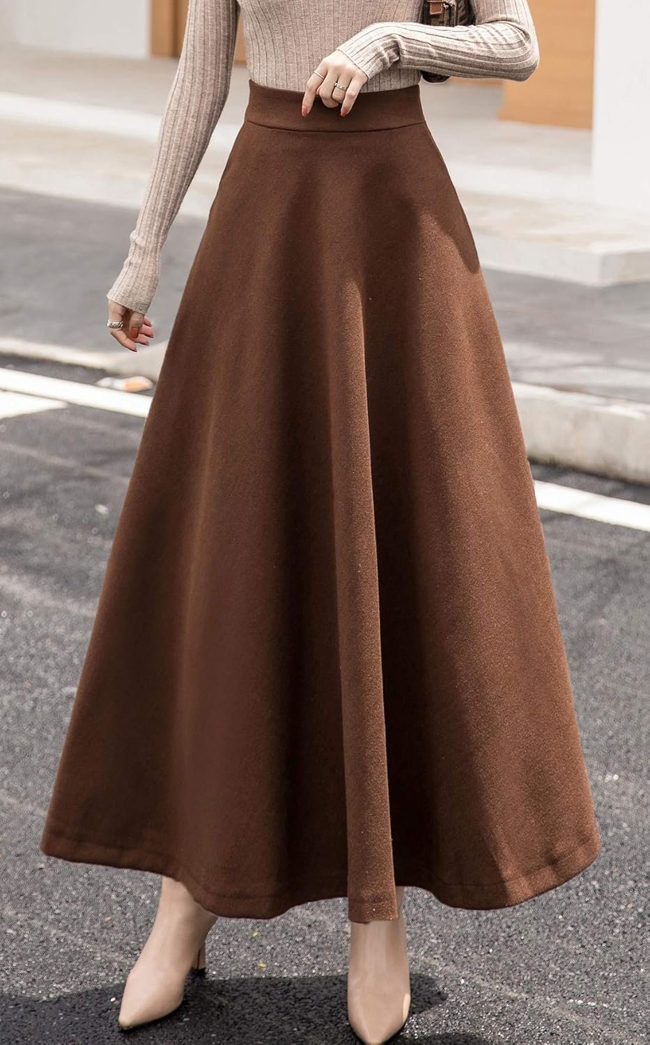 chouyatou Women’s Fall Winter A-Line Swing Pleated Long Maxi Wool Skater Skirt