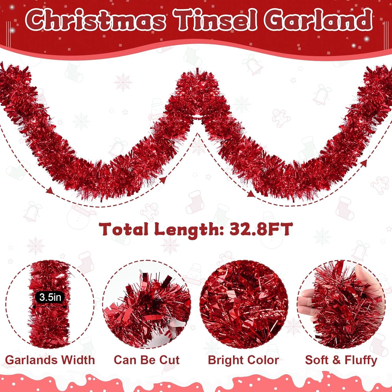 Refined Christmas Tinsel Garland: This 32.8-foot red tinsel garland, featuring a 3.5-inch width, is designed to add a touch of elegance and festive cheer to any Christmas celebration. The combination of wide and narrow strips creates a rich, layered look that sparkles beautifully under holiday lights, is the perfect addition to any Christmas celebration.