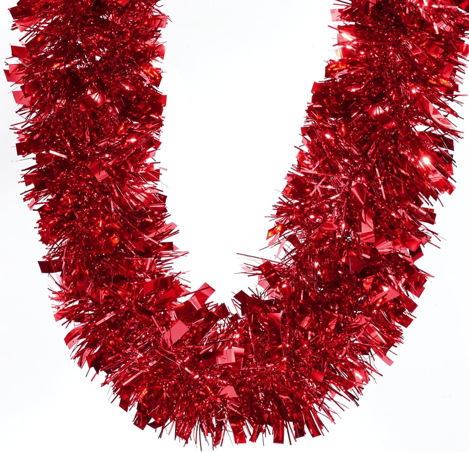 Elegant Design: The red tinsel garland features a mix of wide and narrow strips, creating a visually appealing and textured appearance. The bright and vivid color adds a stunning metallic finish that reflects light, making it a standout piece in your holiday decor.