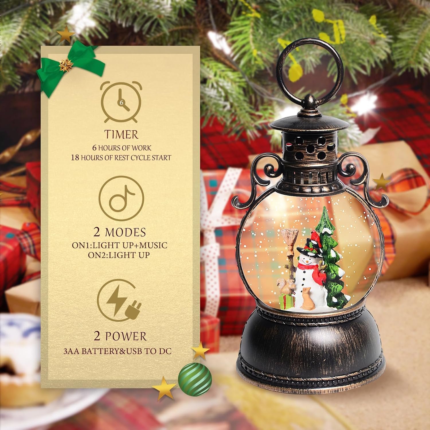 【TWO WAY POWERED】The snow globe can be powered using the included USB DC cable, or it can be powered by 3 AA batteries (not included). In order to save energy, christmas table decorations has a 6-hour timer. When the switch be turned on and the after the lantern working for 6 hours, the lantern will be turned off automatically. NOTE: If the sequins are stuck to the frame, please turn on the snowball lamp and leave it for two days, the sequins will fall off automatically.