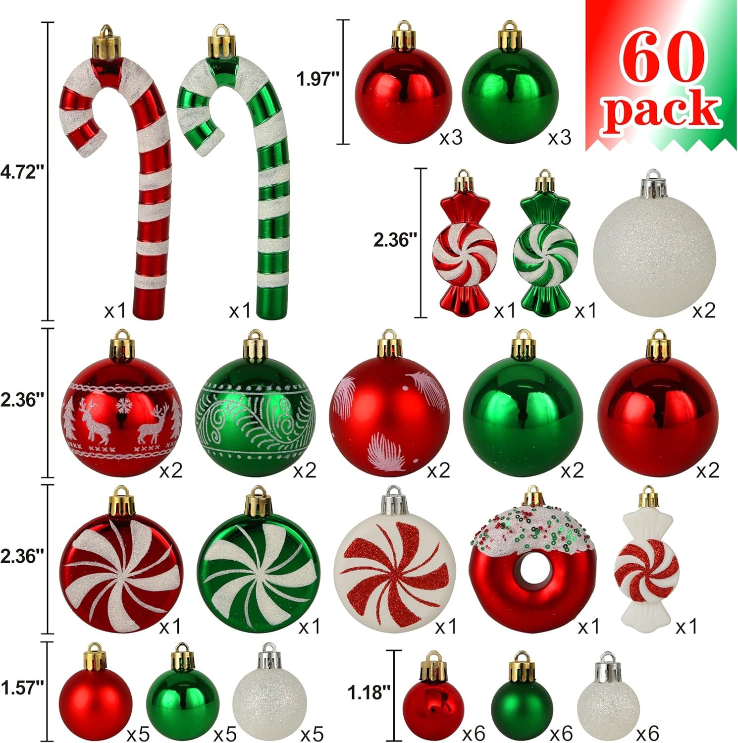 Traditional Christmas Tree Ornaments-there are 60 piece green red white ornaments in this Christmas ornaments set, small and big ones such as candy, donut, different size of balls, these ornaments all made out of shatterproof plastic, friendly for the family with kids and pets