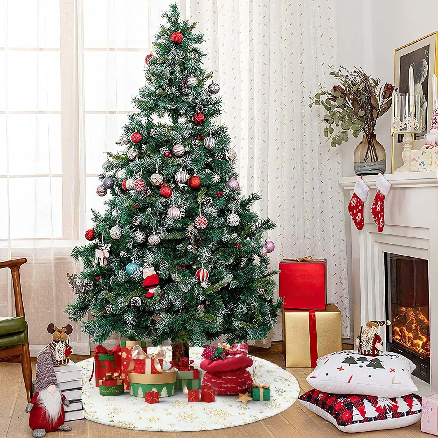 【Ideal Coverage】: With a standard diameter of approximately 36inch, our chrismas tree skirt ensures comprehensive coverage of your tree base, seamlessly concealing wires or the stand for a neat aesthetic. Furthermore, it acts as a protector against fallen pine needles and sap, safeguarding your floors.