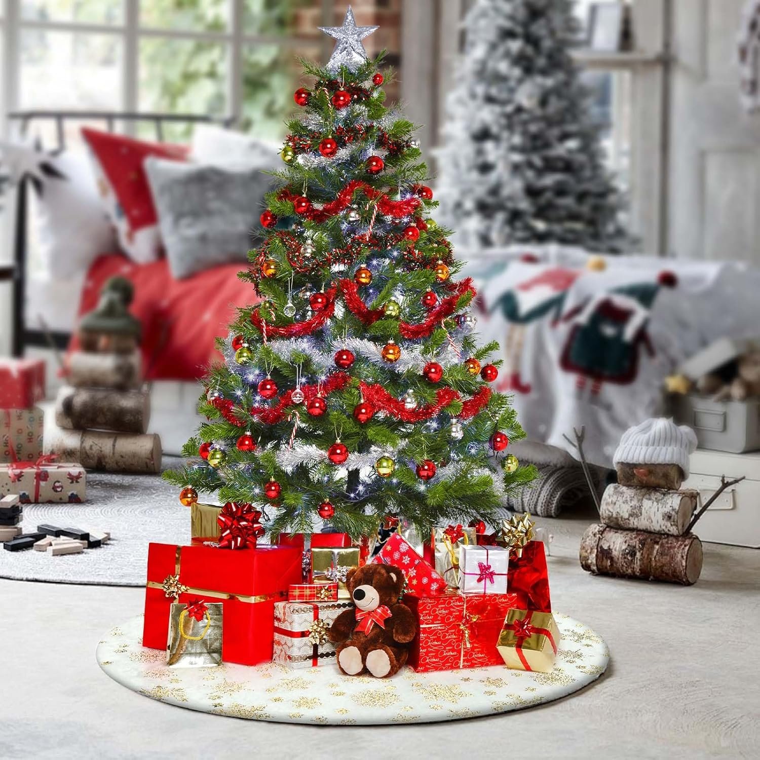 【Luxurious Festive Charm】: Add the finishing touch to your festive décor with the exquisite christmas tree skirt, available in white or red, a must-have accessory for your christmas celebrations.