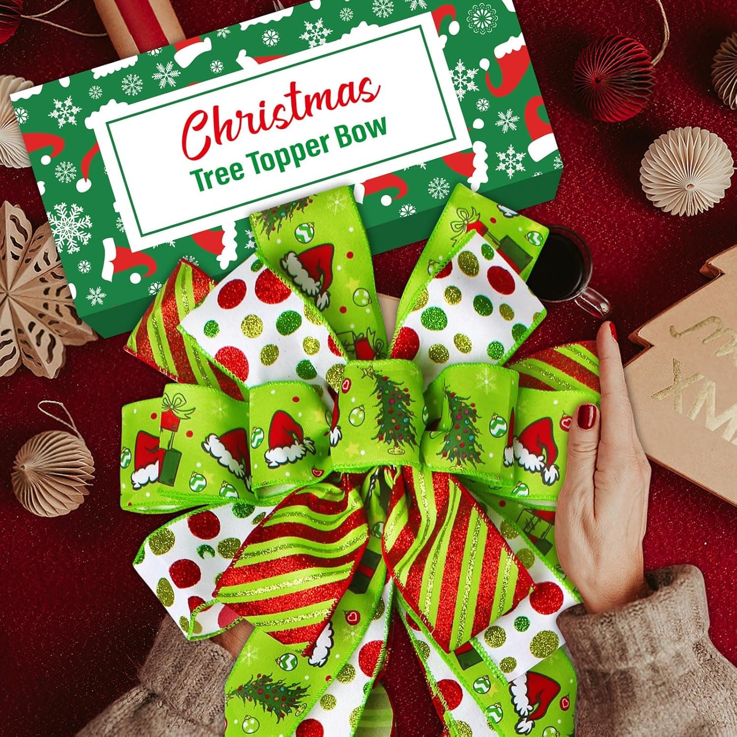 Versatile:Our green Christmas Tree Topper bow can add more holiday touch to your home.They would be a great addition to Christmas tree,Xmas wreath,garland,swag,front door,window,chair,stairs,banisters,fences,tree,etc