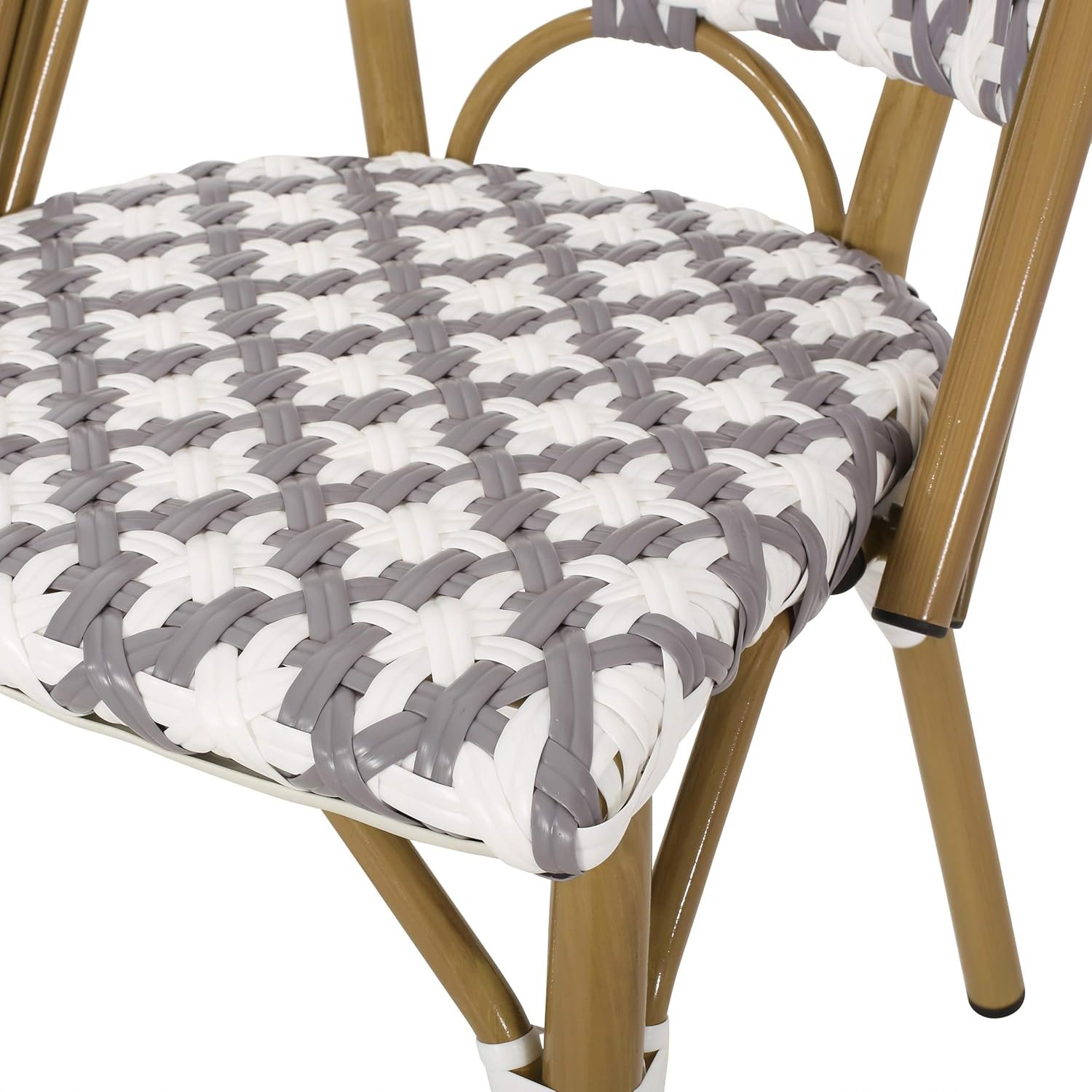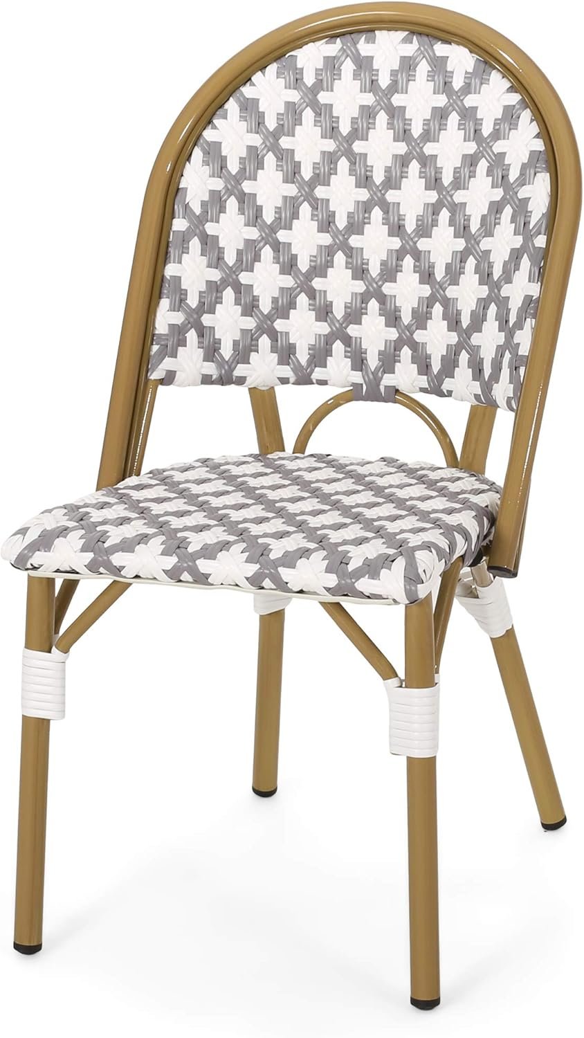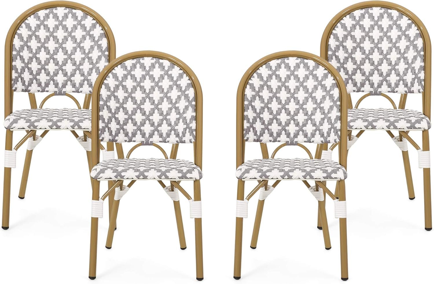 Fashion your outdoor space with an upper-class French cafe vibe by adding the right accessories. Built with bamboo finished aluminum frames, our chair set not only offers a natural touch with its charming design but it also showcases outstanding durability. The seat and backrests are finished with stunning wicker which brings refreshing breathability and style to your summer lounging. Perfect to pair with a side table or your favorite bistro table, these accent chairs are sure to bring your outdoor space to the next level. Includes: Four (4) Dining Chairs Frame Material: Aluminum Seat and Back Material: Faux Rattan Wrapping Material: Faux Rattan Frame Finish: Bamboo Print Seat and Back Color: Gray and White Hand-Crafted Details Assembly Required Dimensions: 21.50 inches deep x 18.50 inches wide x 35.00 inches high Seat Dimensions: 16.50 inches deep x 16.00 inches wide x 17.50 inches high