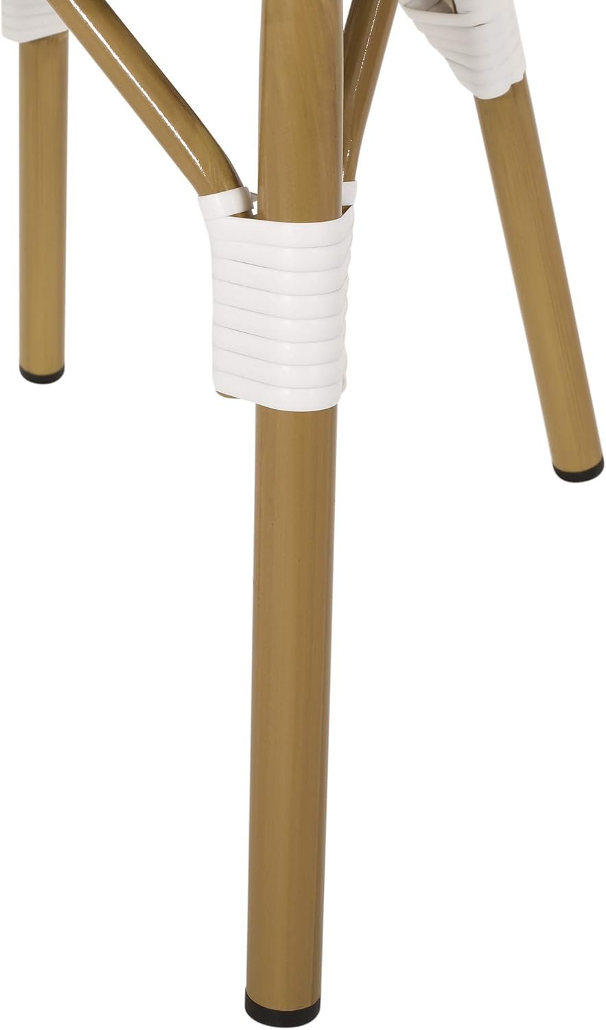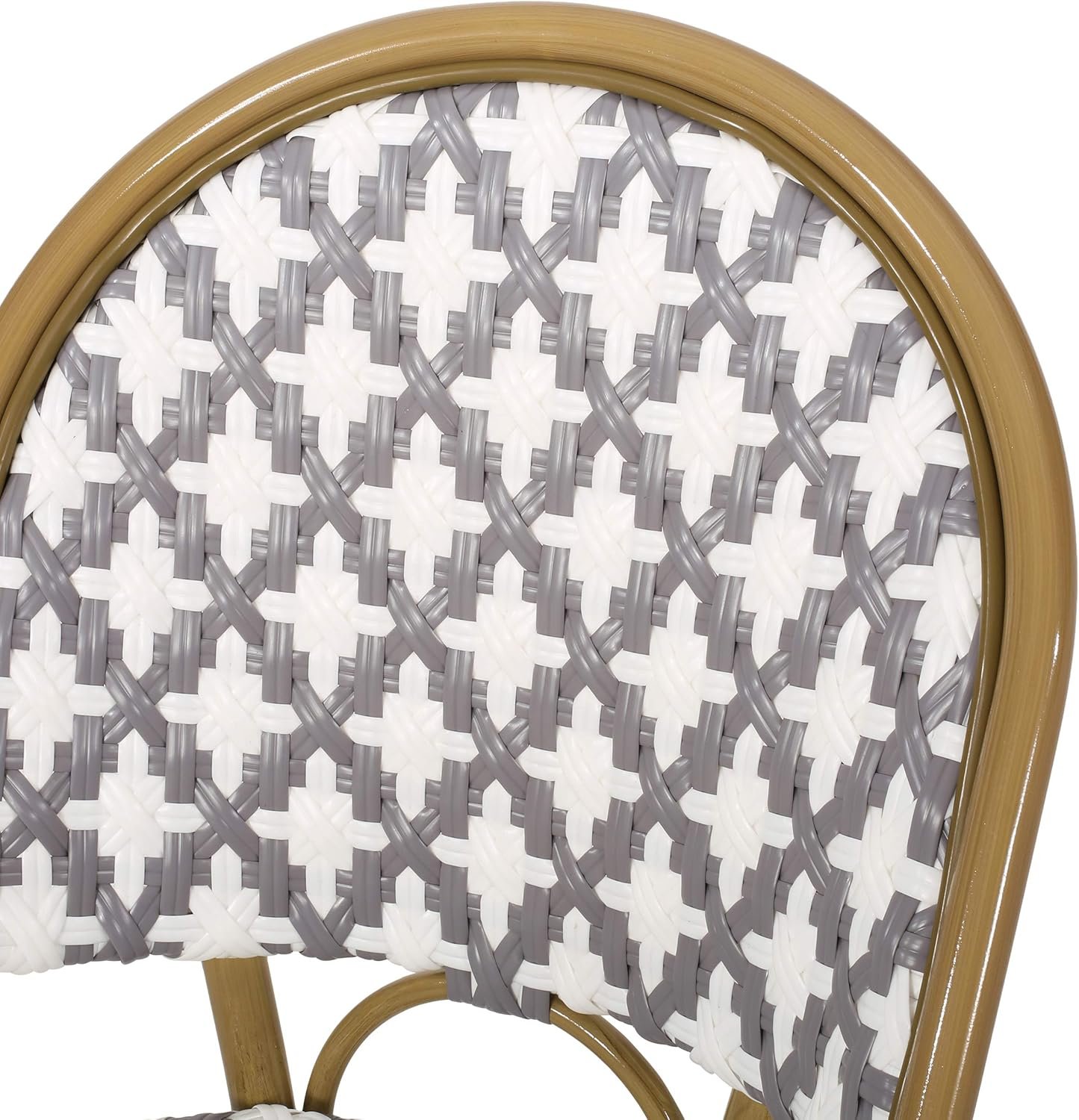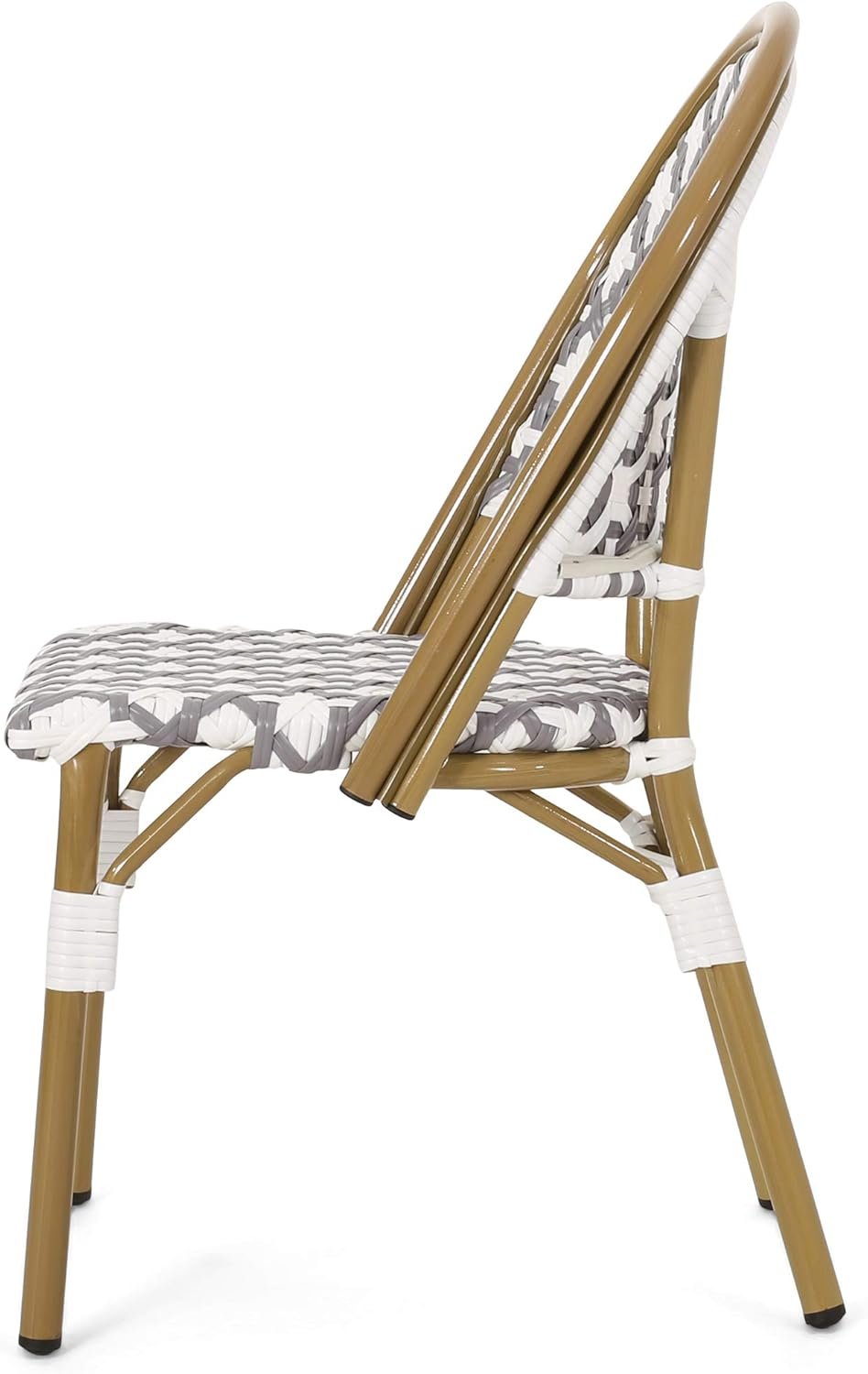 Fashion your outdoor space with an upper-class French cafe vibe by adding the right accessories. Built with bamboo finished aluminum frames, our chair set not only offers a natural touch with its charming design but it also showcases outstanding durability. The seat and backrests are finished with stunning wicker which brings refreshing breathability and style to your summer lounging. Perfect to pair with a side table or your favorite bistro table, these accent chairs are sure to bring your outdoor space to the next level. Includes: Four (4) Dining Chairs Frame Material: Aluminum Seat and Back Material: Faux Rattan Wrapping Material: Faux Rattan Frame Finish: Bamboo Print Seat and Back Color: Gray and White Hand-Crafted Details Assembly Required Dimensions: 21.50 inches deep x 18.50 inches wide x 35.00 inches high Seat Dimensions: 16.50 inches deep x 16.00 inches wide x 17.50 inches high