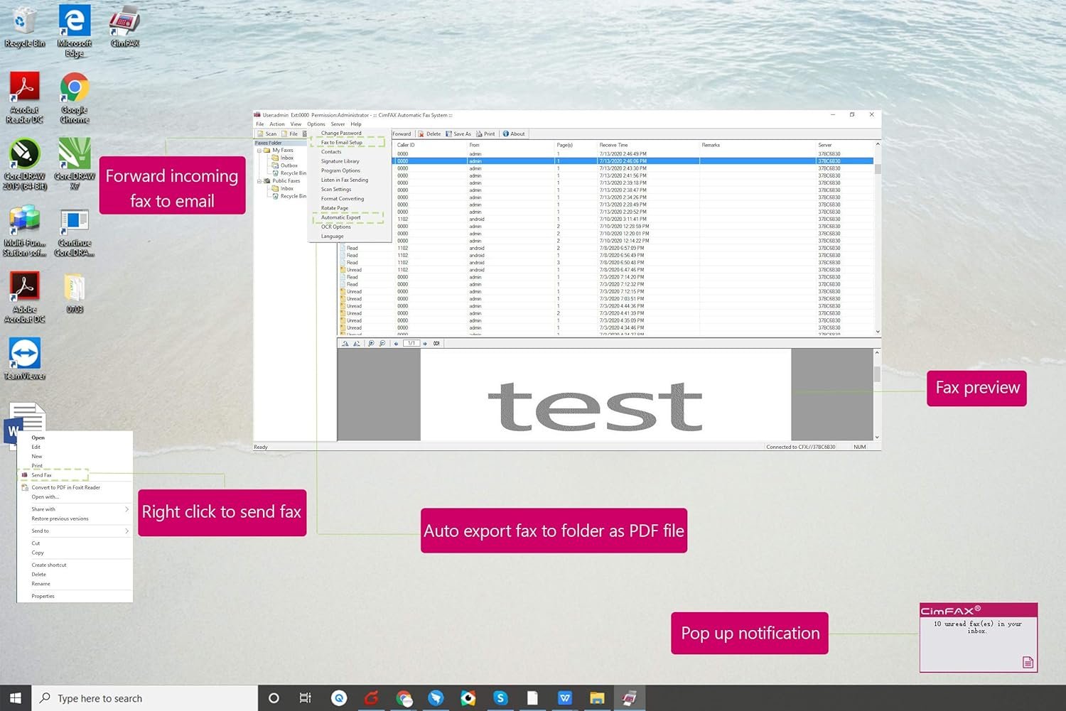 Right Click or print with CimFAX virtual printer to send fax on Windows computer. Receives fax 24/7. Easy-to-use software.