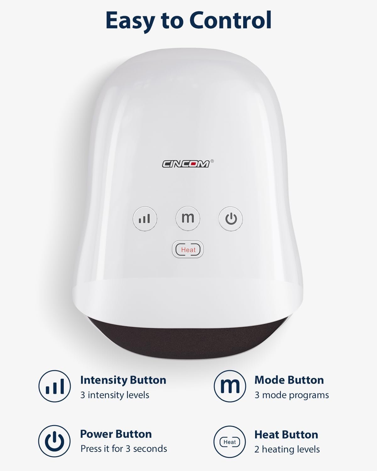 Hand Massager with Heat: CINCOM hand therapy massager provides different acupuncture points and offers a kneading massage with 4 massage heads. Upper and lower airbags press rhythmically along the fingers, hands, and wrists to care for all sides of your hand