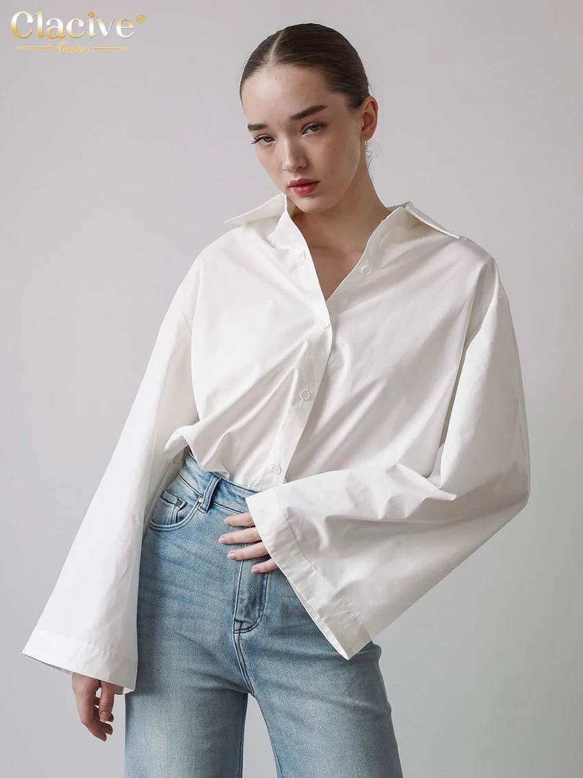 Clacive Fashion Loose White Cotton Women’s Blouse 2025 Casual Lapel Long Sleeve Shirt Elegant Classic Solid Top Female Clothing