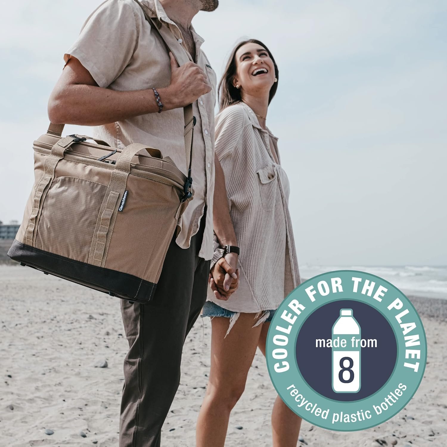 [WHY THESE ROCK]: This soft sided portable cooler keeps your bevvies cold with a premium leakproof liner that doesn’t leak like a backpack cooler that uses a thinner liner. Our sturdy but collapsible beach cooler is much lighter & easier to handle than a hard cooler, making it one of your top beach necessities or camping essentials. Our insulated coolers include a bottle opener, multiple pockets & are made from recycled materials