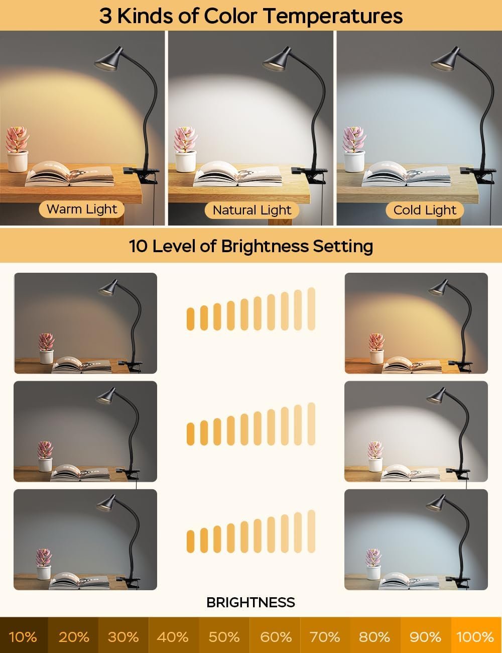 💡 【MOST COMFORTABLE LIGHTING SOURCES】This clamp light features with 3 Lighting Modes: warm white light (3000K), natural light (4500K) and cool white light (6500K). Each modes have 10 levels Brightness, so that it create 30 illumination modes, meet all your requirements. Clip on bedside or headboard and reading in bed, comfortable light brings you comfortable life!
