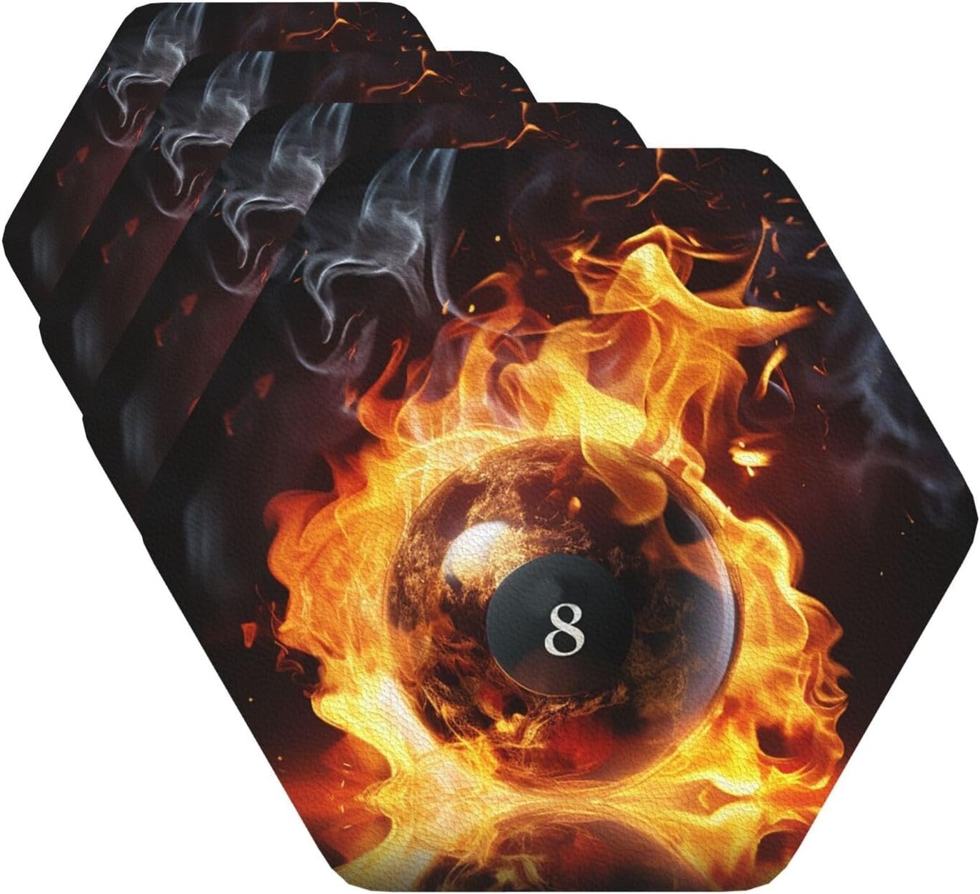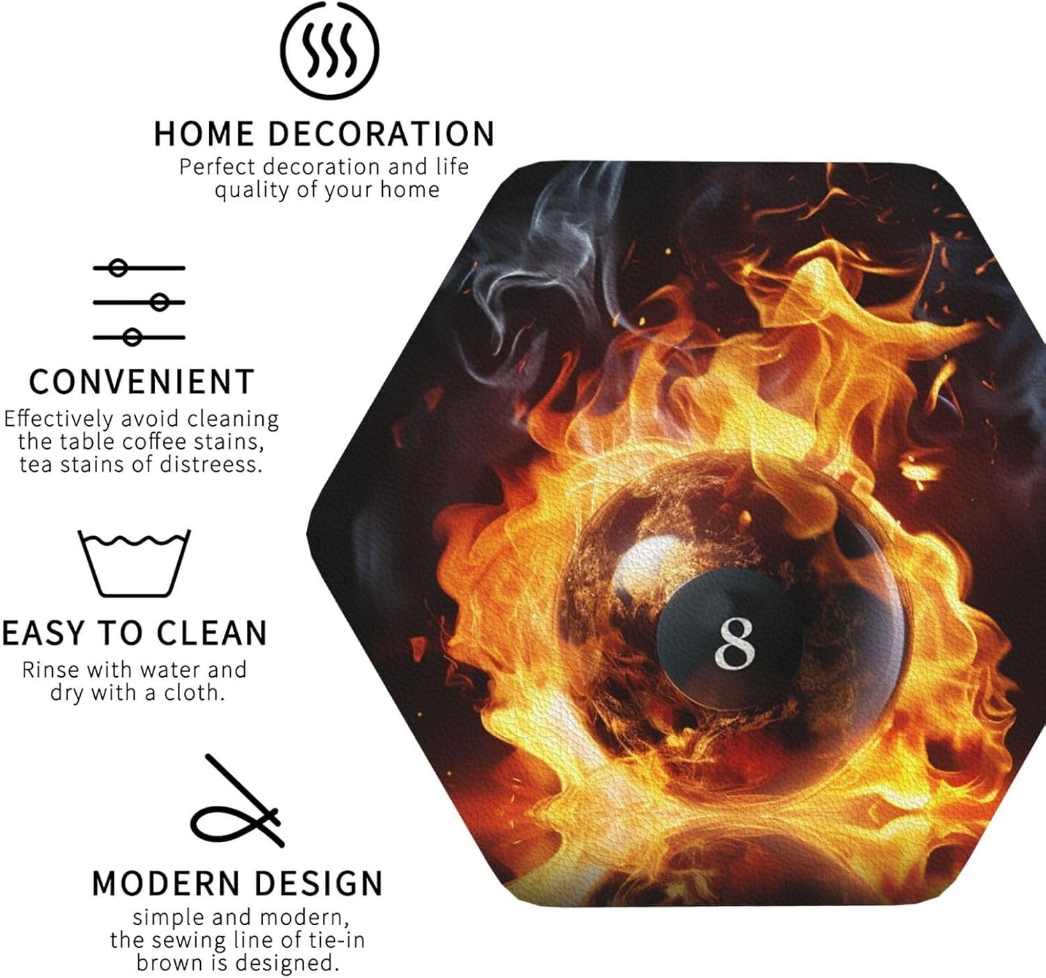 Premium Material: High quality PU leather drink coaster, that won’t absorb odor, stain, crack or chip more durable. Billiard ball on fire Funny coaster are very soft and do not have to worry about scratching the furniture countertop and making noise when moving.