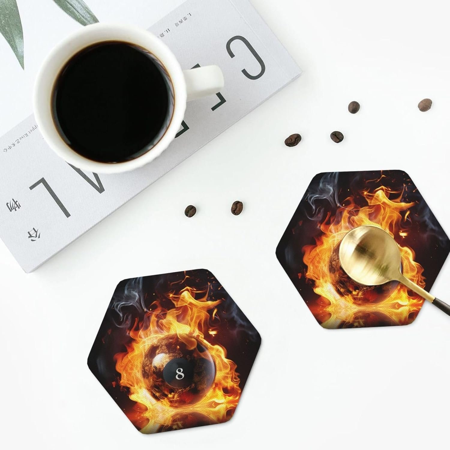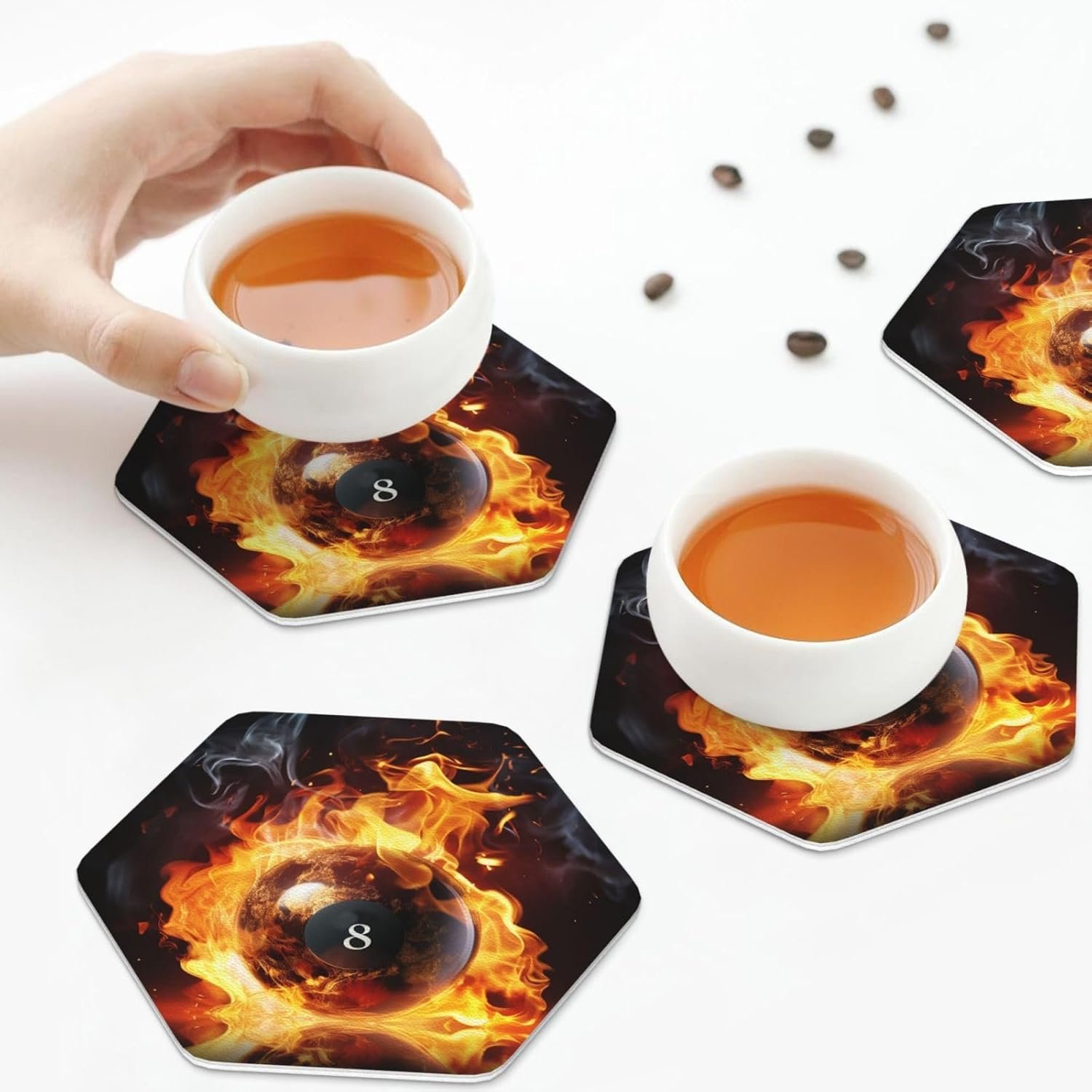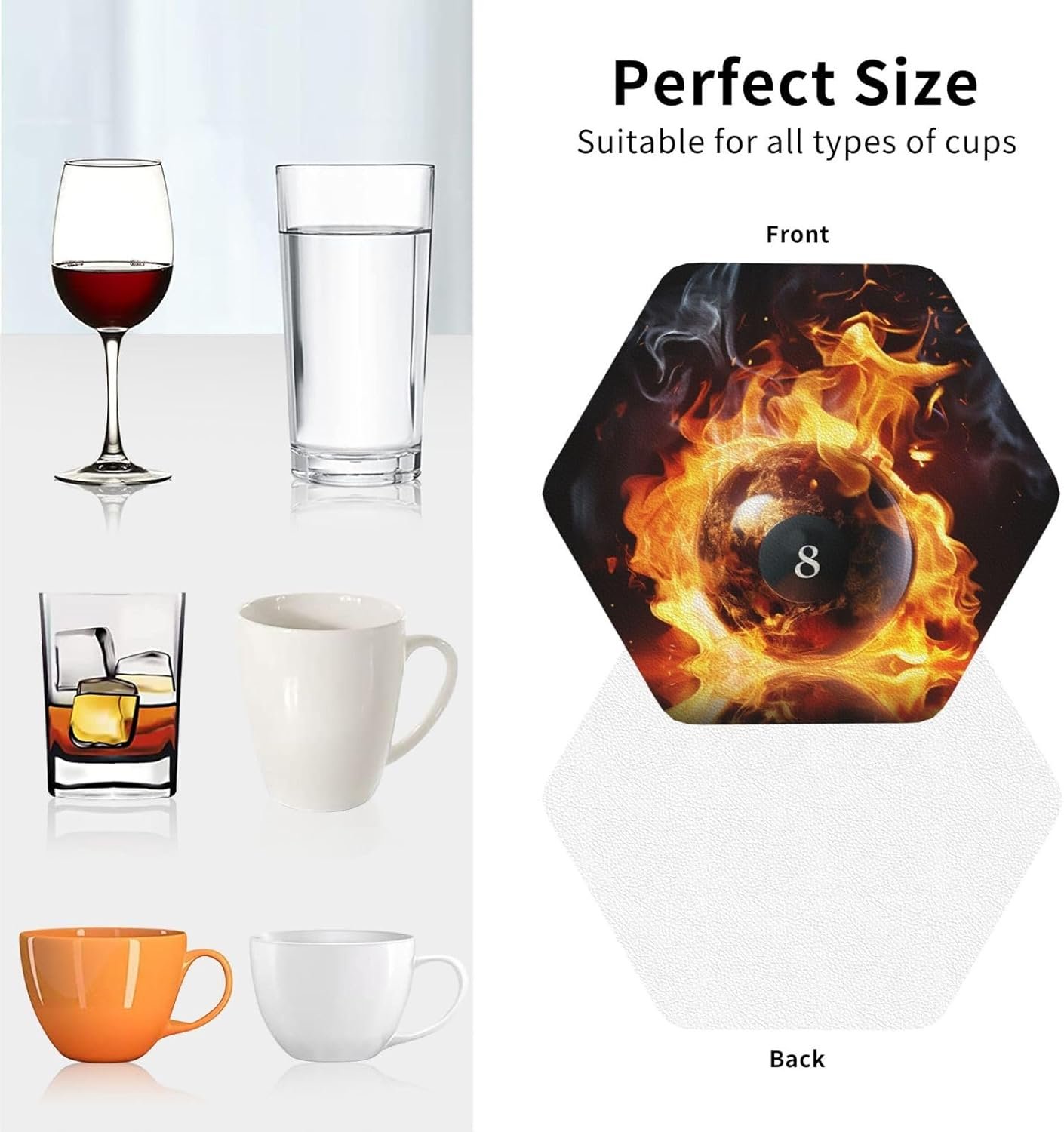 Non-slip Bottem: Billiard ball on fire Office coasters workmanship is fine, the coaster surface is flat, the stability is stronger, and the cup will not be overturned. Non-slip coasters smart protect the surface of your kitchen counter tabletop, office desk or bedside furniture from nasty marks or scary scratch.