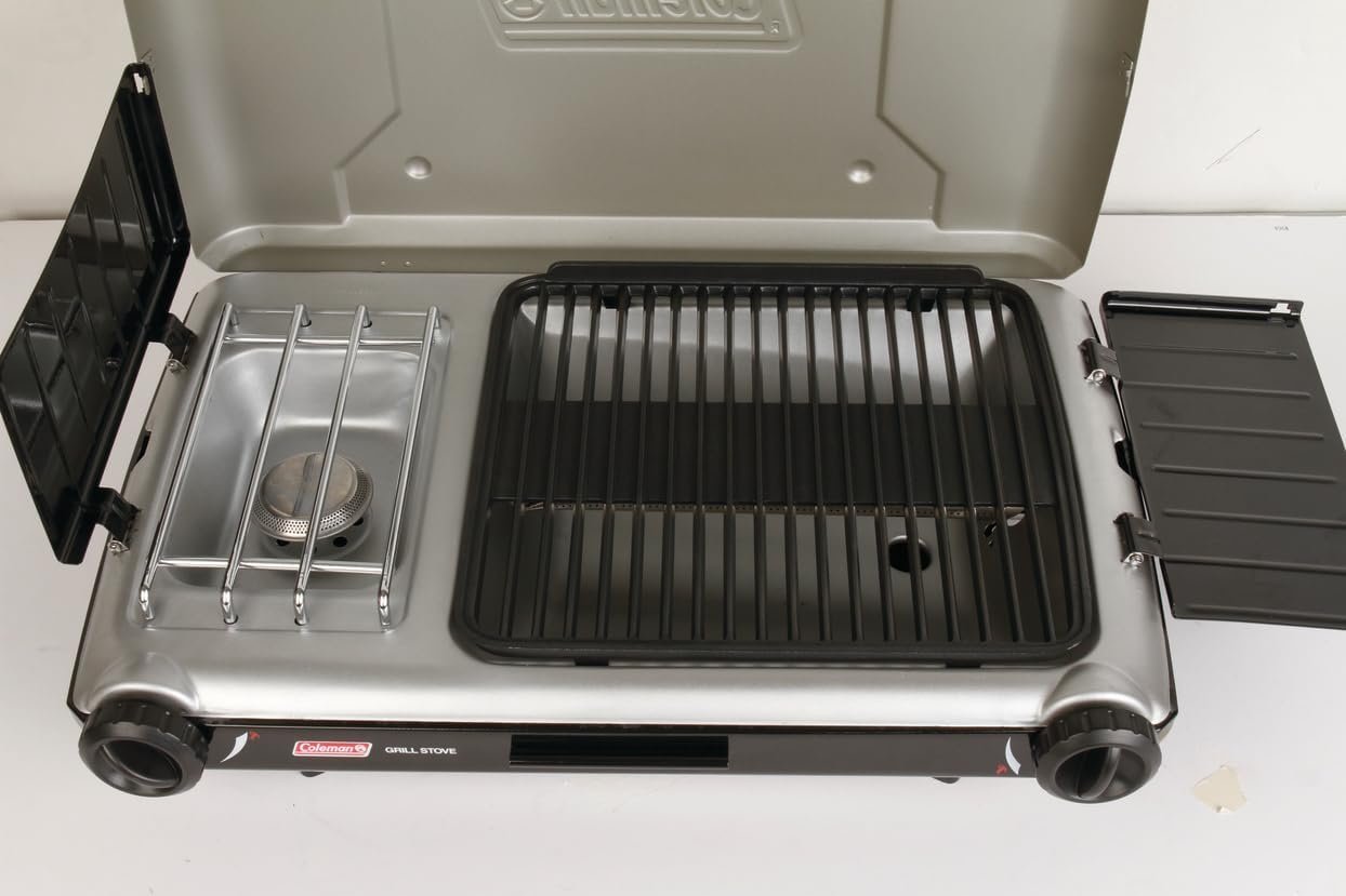 Coleman Tabletop 2-in-1 Grill & Stove with 2 Adjustable Burners, Propane Grill/Stove with Push-Button Starter, Wind Guards, Grease Tray, & 20,000 BTUs of Power for Camping, Tailgating, & More