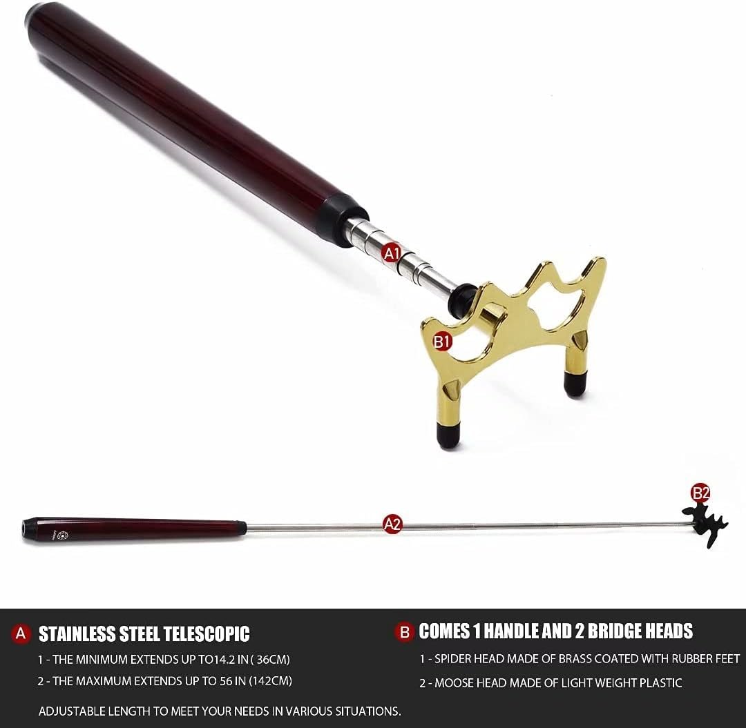 【Retractable】This telescopic pool cue bridge stick features a stainless steel length adjustable stick with a metal screw head for replaceable other bridge head,No screws or tools required,the maximum extends up to 56 IN (142CM) .