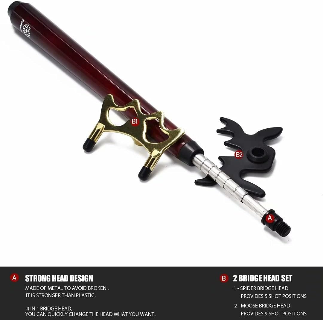 【4-In-1 Head Design】This billiard cue bridge stick Provides 4-In-1 head,The head made of metal with screw that ensure to avoid broke when it hit the floor,It is more stronger than other plastic head,It can be easily for replace the head to high brass head ,spider head, cross head or Moosehead.