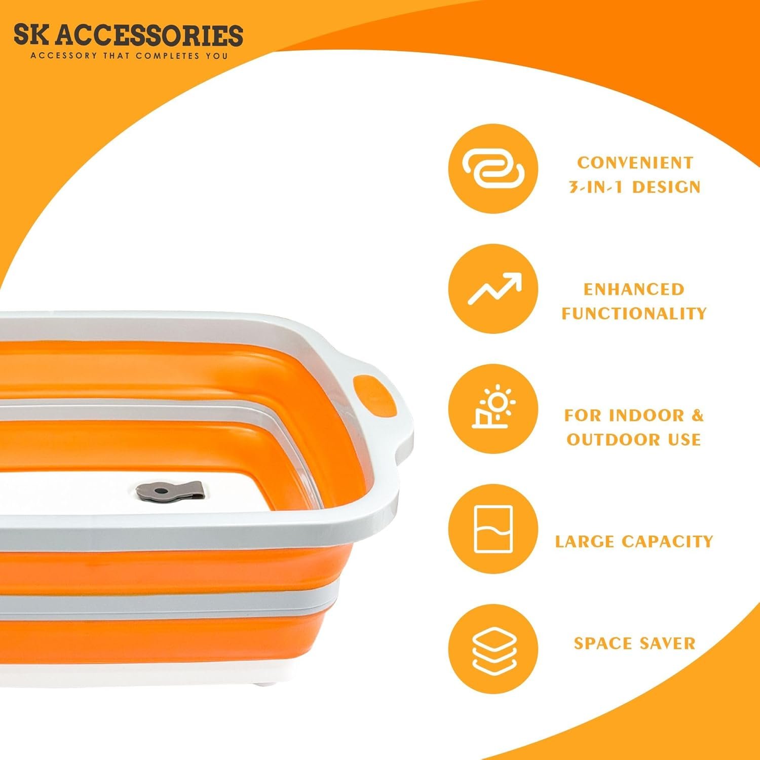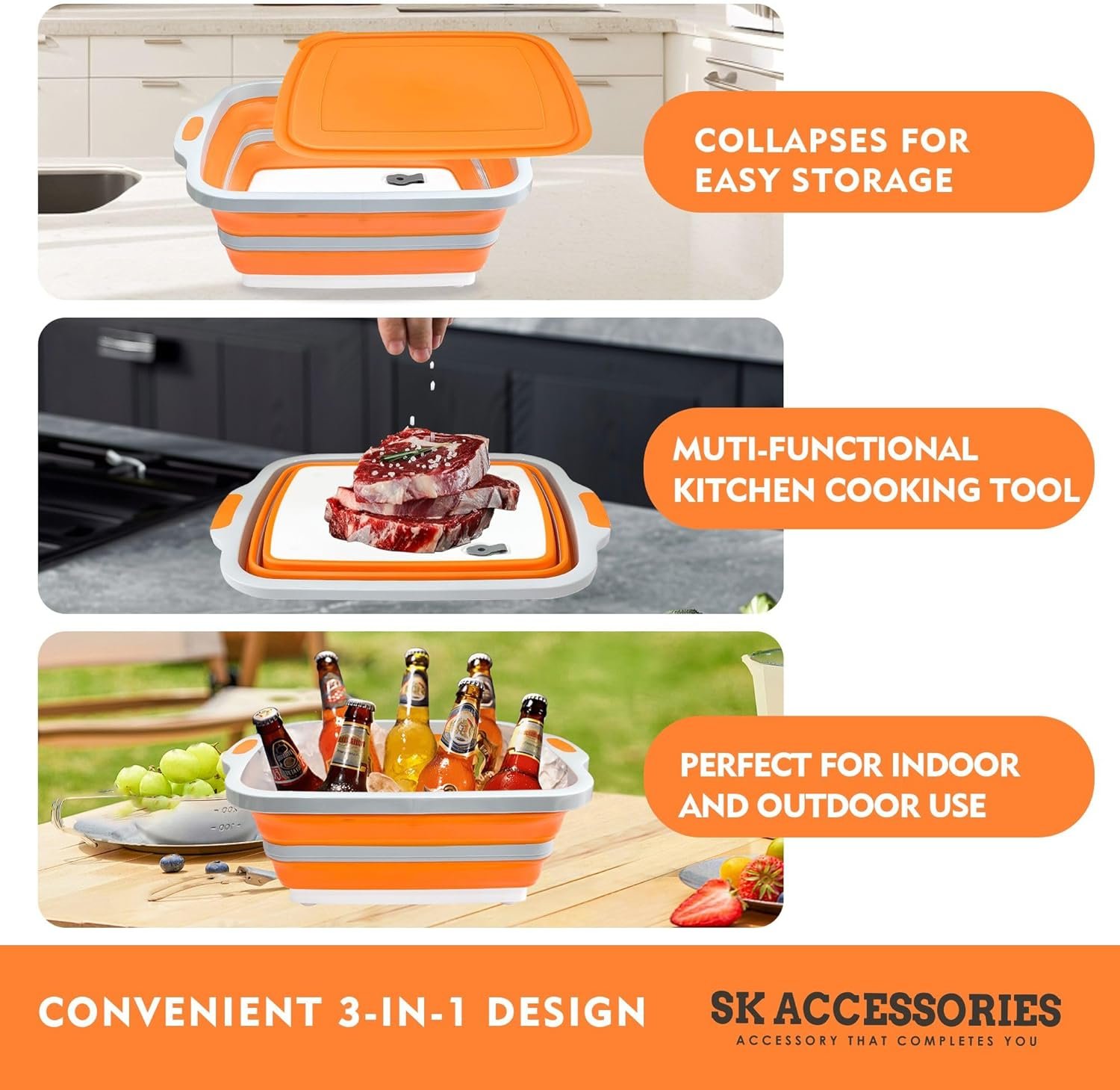 The SK ACCESSORRIES BBQ Prep Tub is a versatile and portable solution for grilling, meal prep, marinating, and food storage. This all-in-one prep tub combines functionality with convenience, featuring a built-in cutting board, collapsible design for easy storage, and a snap-on lid for short-term covering. Made from high-quality, BPA-free materials, it’s dishwasher safe and perfect for outdoor adventures, tailgating, camping, or everyday kitchen use