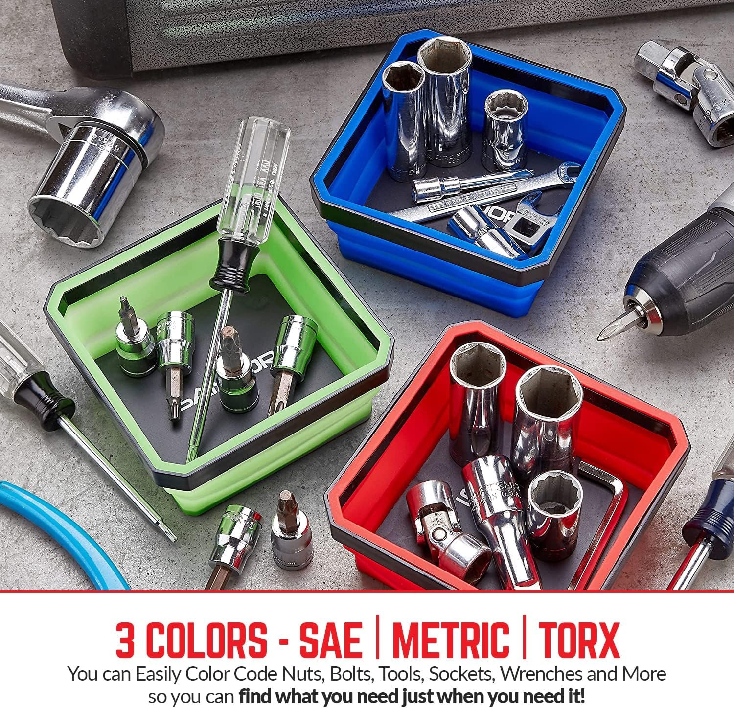 3 COLORS – SAE | METRIC | TORX: Save space and neatly organize your workspace. Every order of Sandor Collapsible Parts Trays includes 1 blue, 1 red, and 1 green parts tray so that you can easily color code nuts, bolts, tools, sockets, wrenches and more. Now you will always be able to find what you need just when you need it!