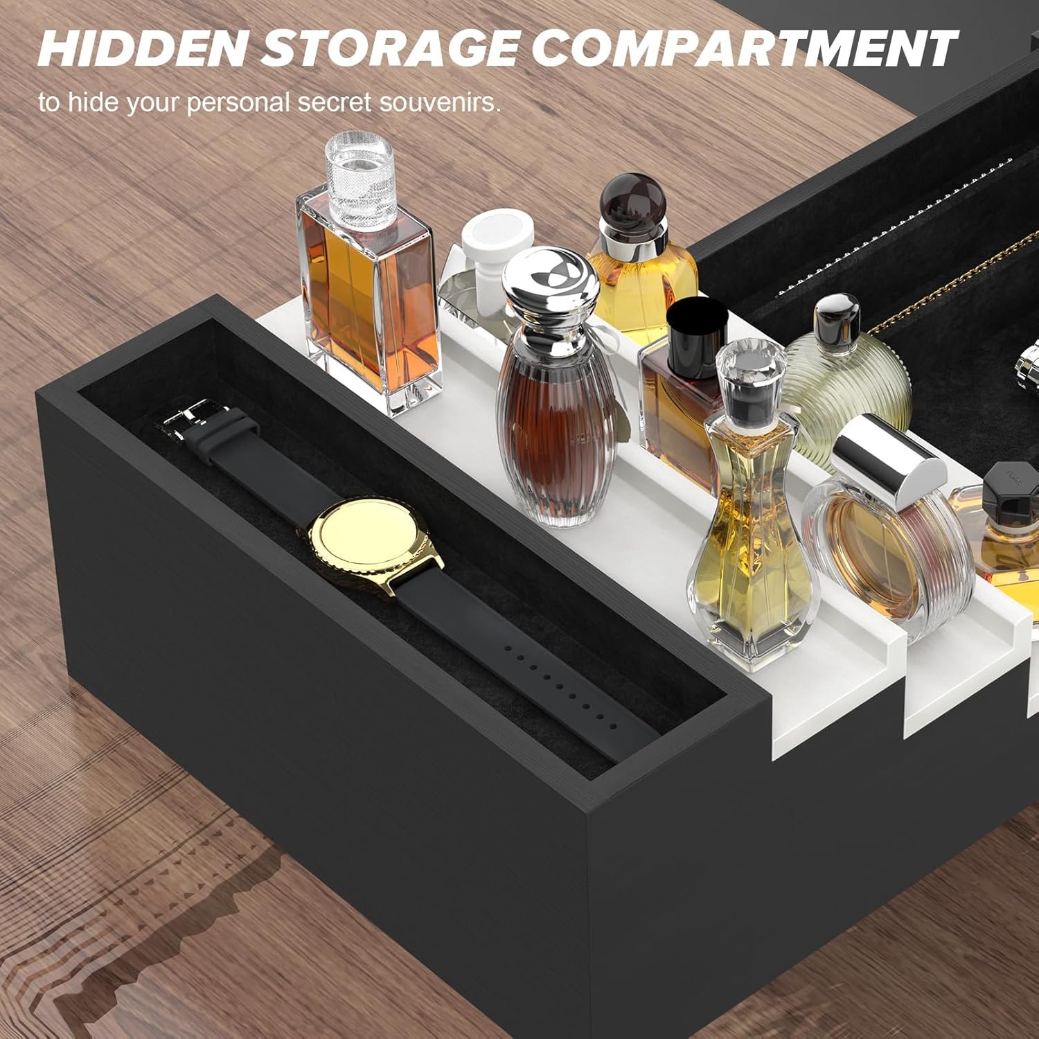 THOUGHTFUL HIDDEN STORAGE COMPARTMENT: Our 4 Tier wooden perfume organizer is designed to give you a unique storage compartment with a lid. Discreetly hide your personal belongings and secret souvenirs such as precious jewellery, bank notes, coins, bank cards, etc. This storage space is designed to suit your individual storage needs.