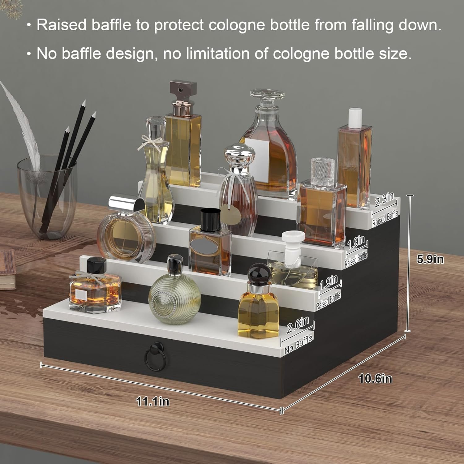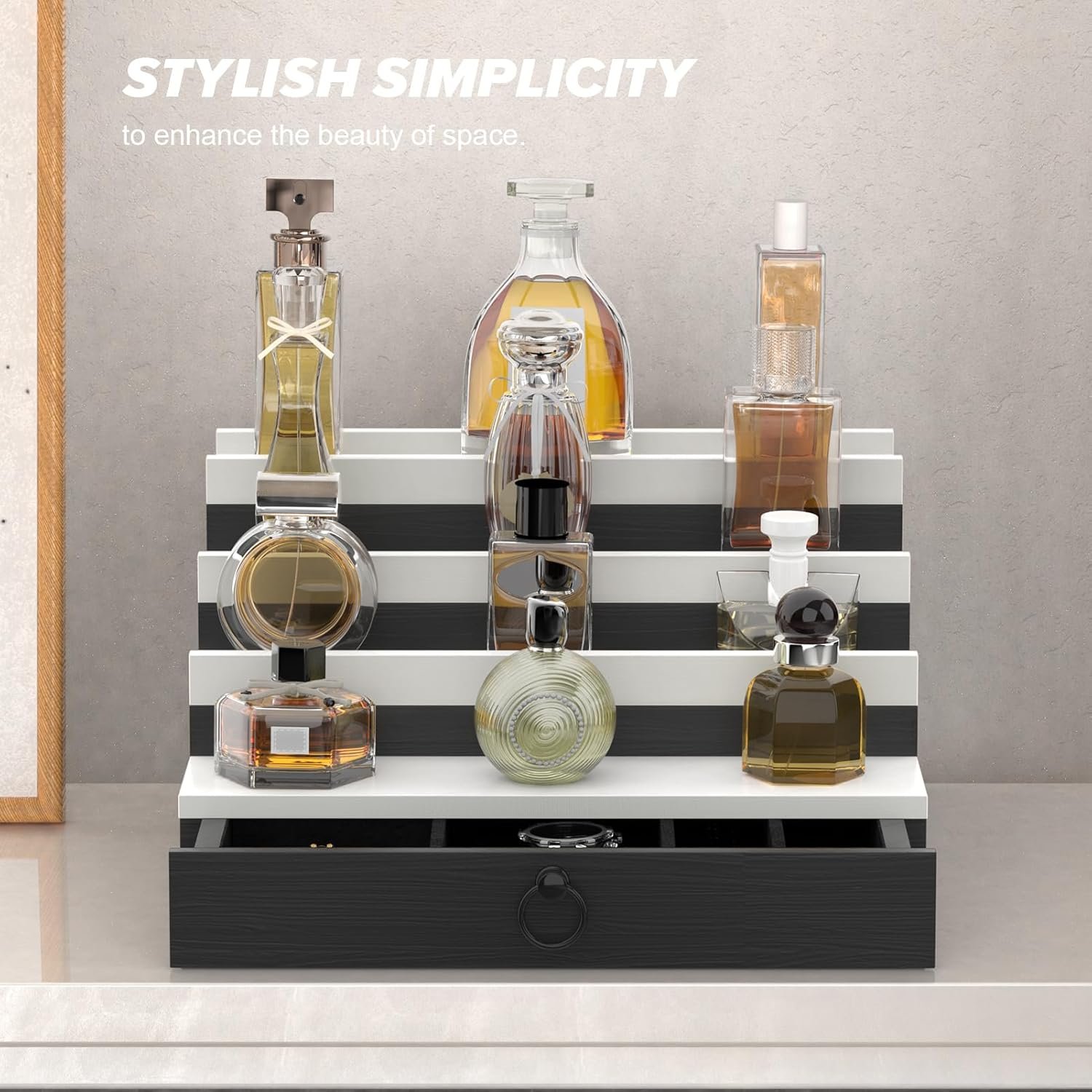 DIVIDED DRAWER COMPARTMENTS FOR MEN’S STYLE: The cologne organizer is compactly designed to enhance the aesthetics of your space.The bottom divider drawer keeps your belongings at a glance and allows you to store watches, rings, bracelets and necklaces. Each level holds multiple bottles of perfume to showcase your unique fragrance tastes, allowing you to easily access and choose your favourite scent.