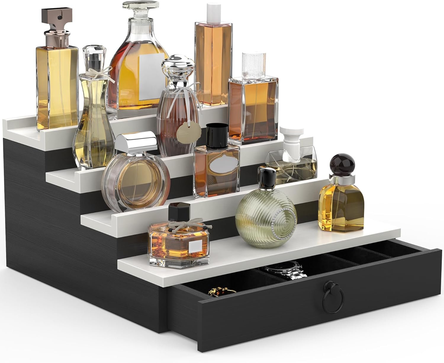 Cologne Organizer for Men, 4 Tier Black Wood Perfume Organizer with Felt Lining Drawer and Hidden Compartment, Perfume Display Holder, A Gift for Men