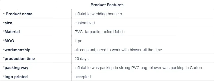 1.What material?A: Inflatable product is made by PVC Tarpaulin. The Flame Retardant is suitable for BS5852(British Standard). Our material have many certifications such as EN-71, UV, 3P Test report.2.Can you customized size or color of product?A: Yes, the size and color can be changed according to your requirement.3. Can you print your picture or logo on the products?A: Yes, we can print your picture or logo on the inflatable products, please offer them in any format made by photoshop orcoredraw.4. Can you design one specially?A: yes, please send us details of your requirements, and we will quote you our best price.5. Miniorder quantity?A: 1PC6. What included in products?A:It is included inflatable games, blowers, kit bag (including the same colors material, glue)7. Your blowers meet CE/UL requirements?A: Yes, our blowers have passed the certificates of CE,UL,GS,PSE and SAA.8. What kind of guarantee you can give?A: Our inflatable games can be used more than 5 years. If it is damaged, you can use the glue and material to repair it, repair kit always send with each games together.9. How do you start the order?A: We will start your order after receiving the down payment which is 50% of total payment, when order finished, we will send you pictures and details for your confirmation, if everything OK, we will send the goods to you after receiving the balance payment.