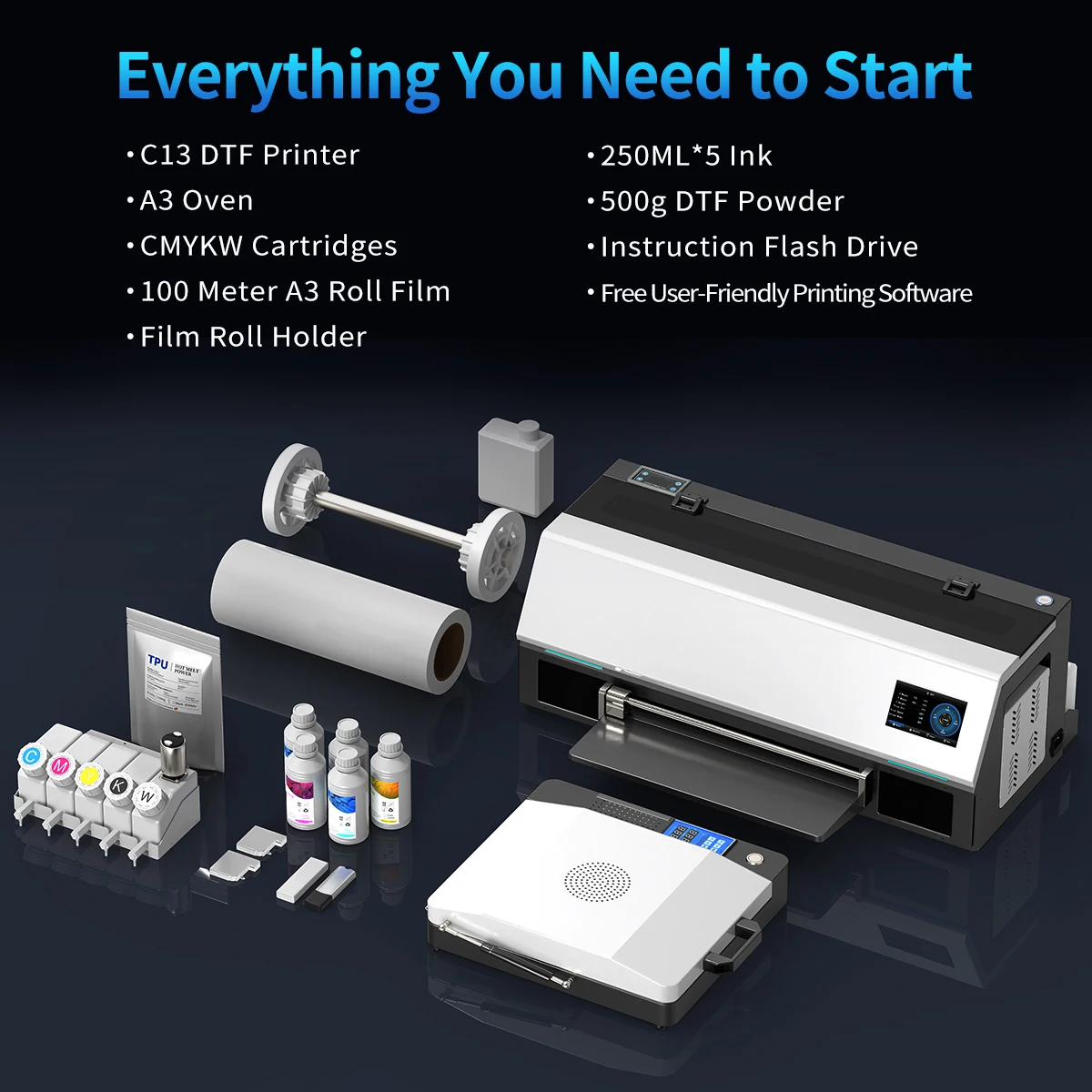 Printer with Ink:1.C13 DTF Printer *1+2.DTF Ink 5*250ML+3.Hot Melt Powder 1kg+4.DTF PET Roll Film 33*100M*1+5.Printing software *1+6.User Manual*1