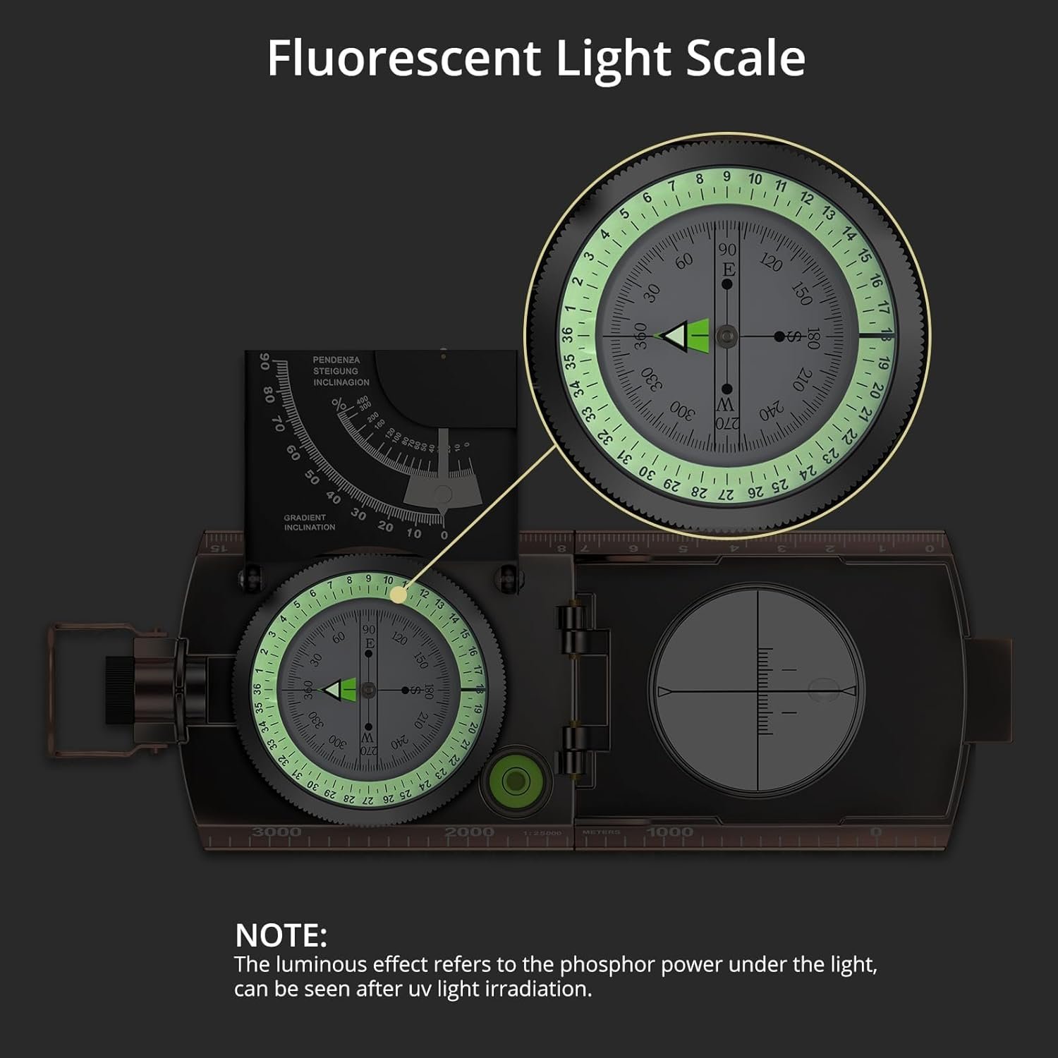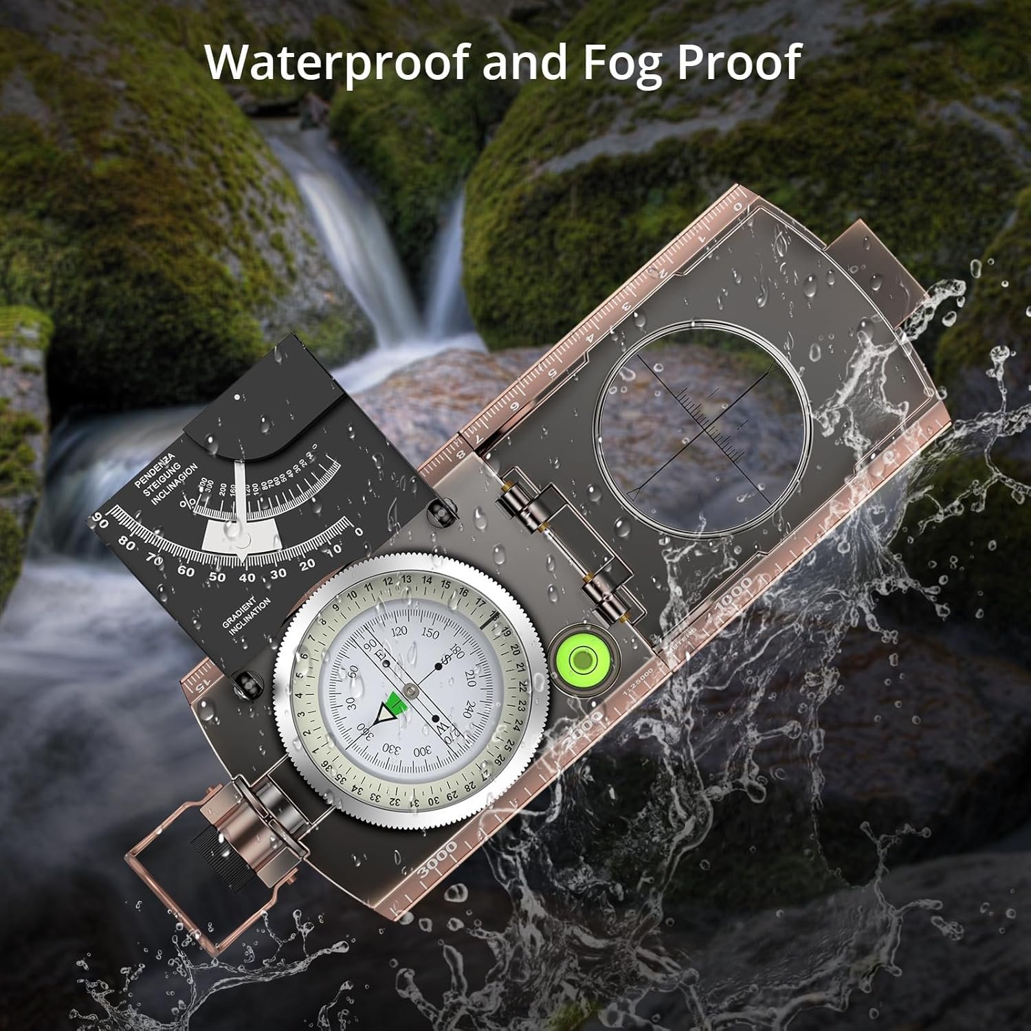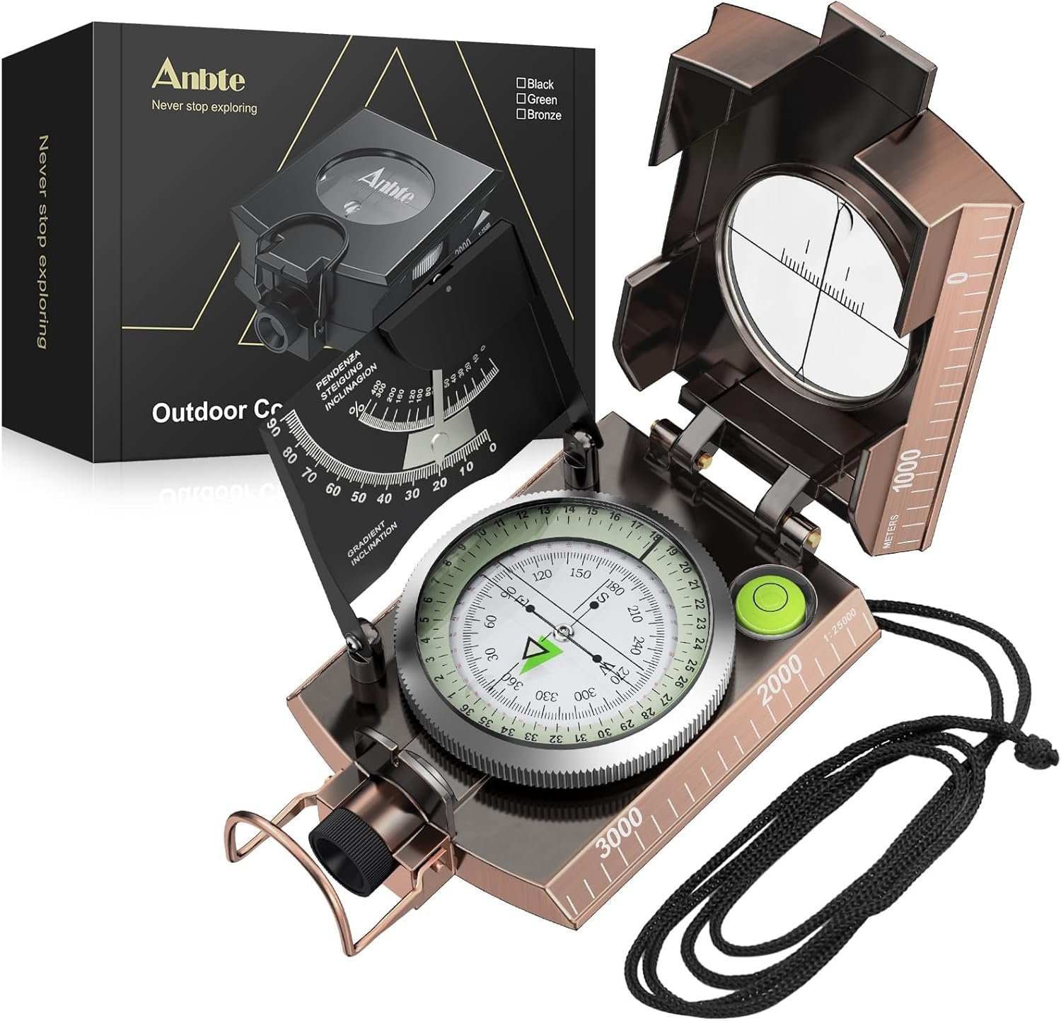 Military Compass with Inclinometer and Graduated Scale: Anbte professional compass is made of high quality zinc alloy metal body, military construction, waterproof and shockproof. Can be used in extreme weather. Built-in inclinometer and side with scale, can measure the slope and height