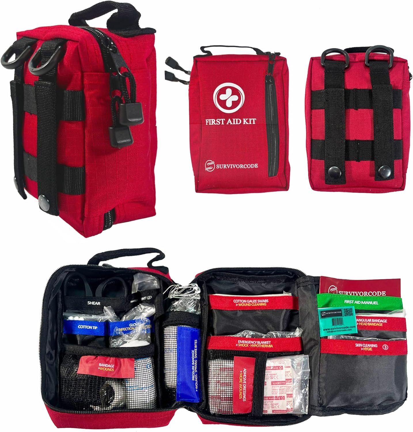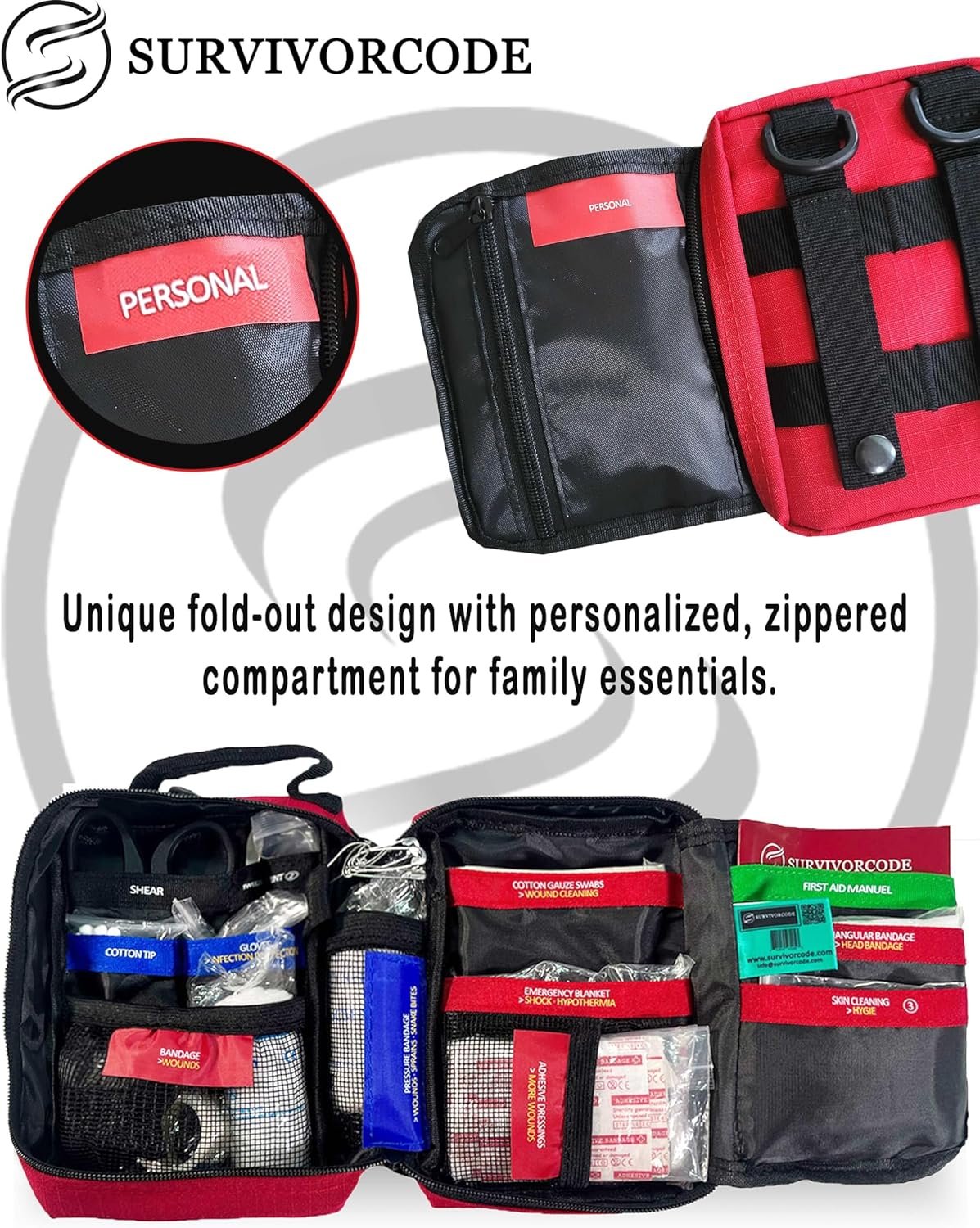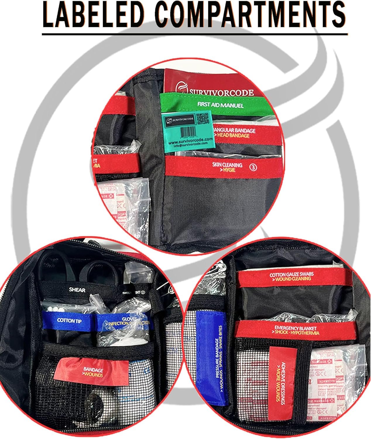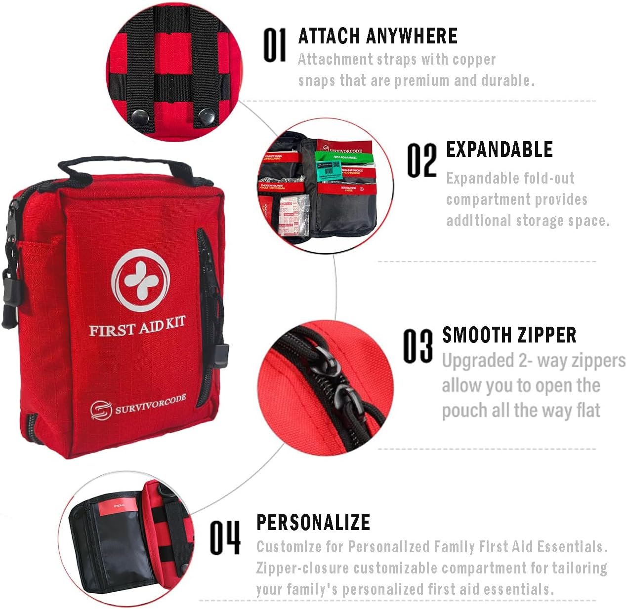 Quick CPR Access: This first aid kit stands out with its removable CPR pouch, ensuring immediate access to life-saving techniques. Whether it’s at home or on the go, having CPR supplies readily available can be a critical factor in an emergency.Efficient Organization: What sets this kit apart is its meticulous organization. Labeled compartments eliminate the need for frantic searching during crises, allowing you to respond promptly to injuries or emergencies without delays.Durability: Crafted from robust 600D Polyester, this kit is built to endure harsh conditions. Its rugged construction ensures the integrity of your essential supplies, ensuring they remain intact and ready for use, even in challenging environments.Rapid Access: The well-thought-out design of this first aid kit ensures swift and clear access to supplies when time is of the essence. In high-pressure situations, quick access to necessary items can significantly impact the outcome of an emergency.Versatile and Portable Travel Companion: This first aid kit is a versatile and highly portable travel companion. Its adaptability shines through with removable MOLLE-compatible components, making it suitable for various scenarios, including cars, homes, or any on-the-go situation. Whether you’re at home or embarking on a travel adventure, this kit ensures you’re prepared for emergencies wherever you go.Personalized Space and Customization: This first aid kit offers a personalized space and customization options, recognizing that every individual and family has unique preferences and medication requirements. With a specialized compartment, you can tailor your kit to meet specific health needs, enhancing your level of preparedness and safety.