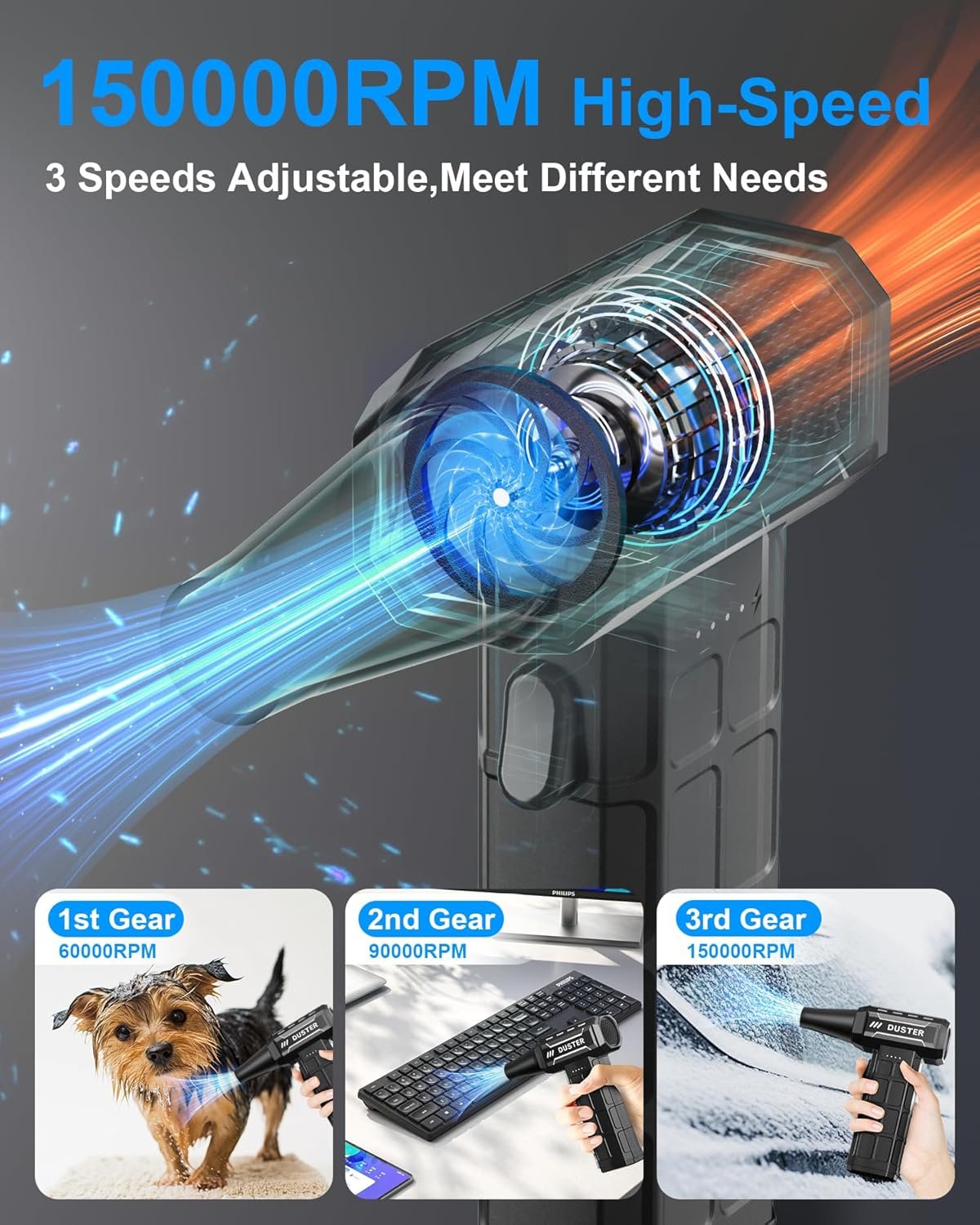Compressed Air Duster-150,000RPM Electric Cleaner, Rechargeable Cordless Air Blower for Keyboard, PC, Electric Devices Cleaning, Turbo Jet Dry Replace Canned Air Compressed Air Cans (Black)