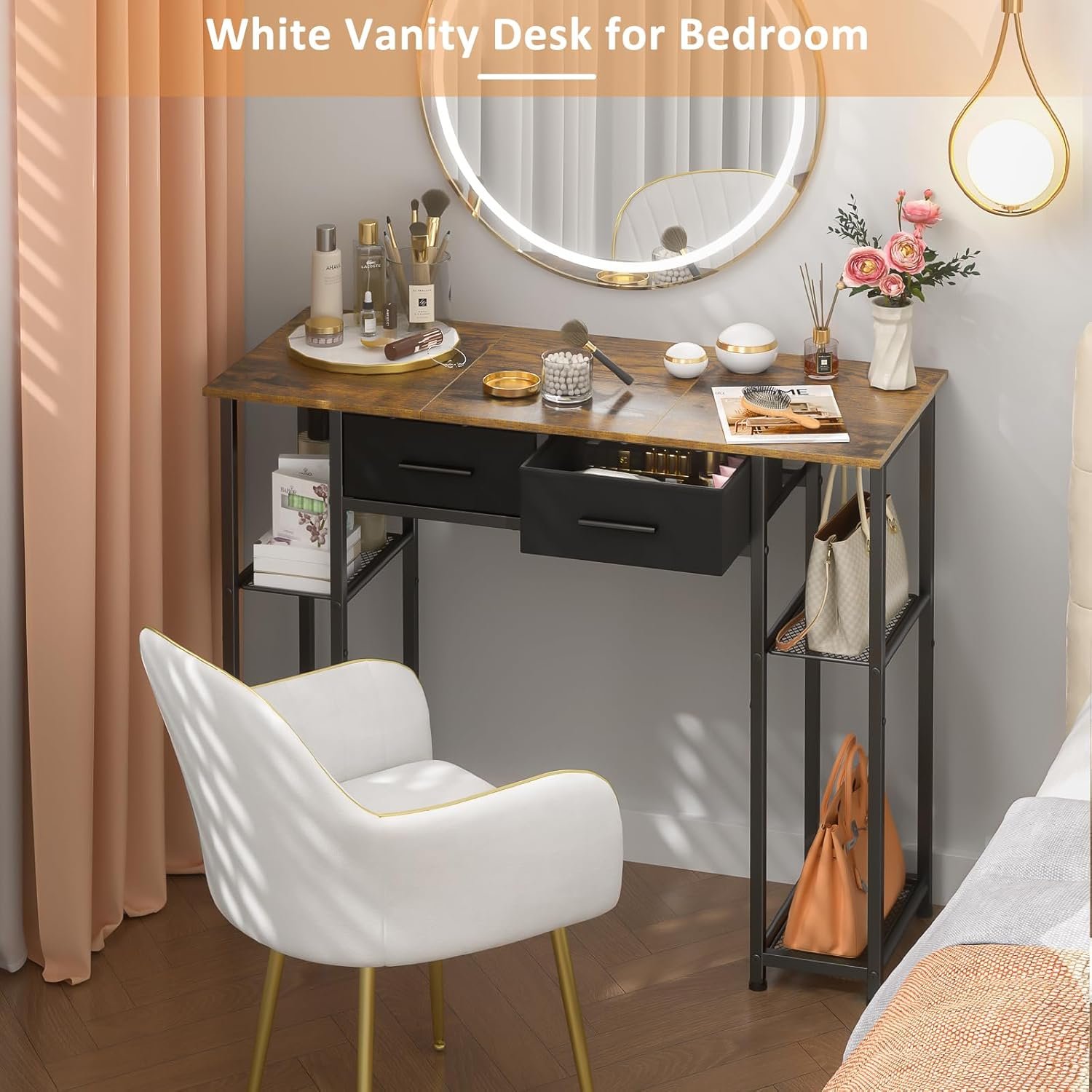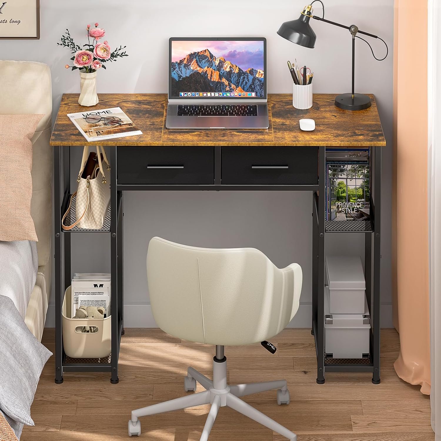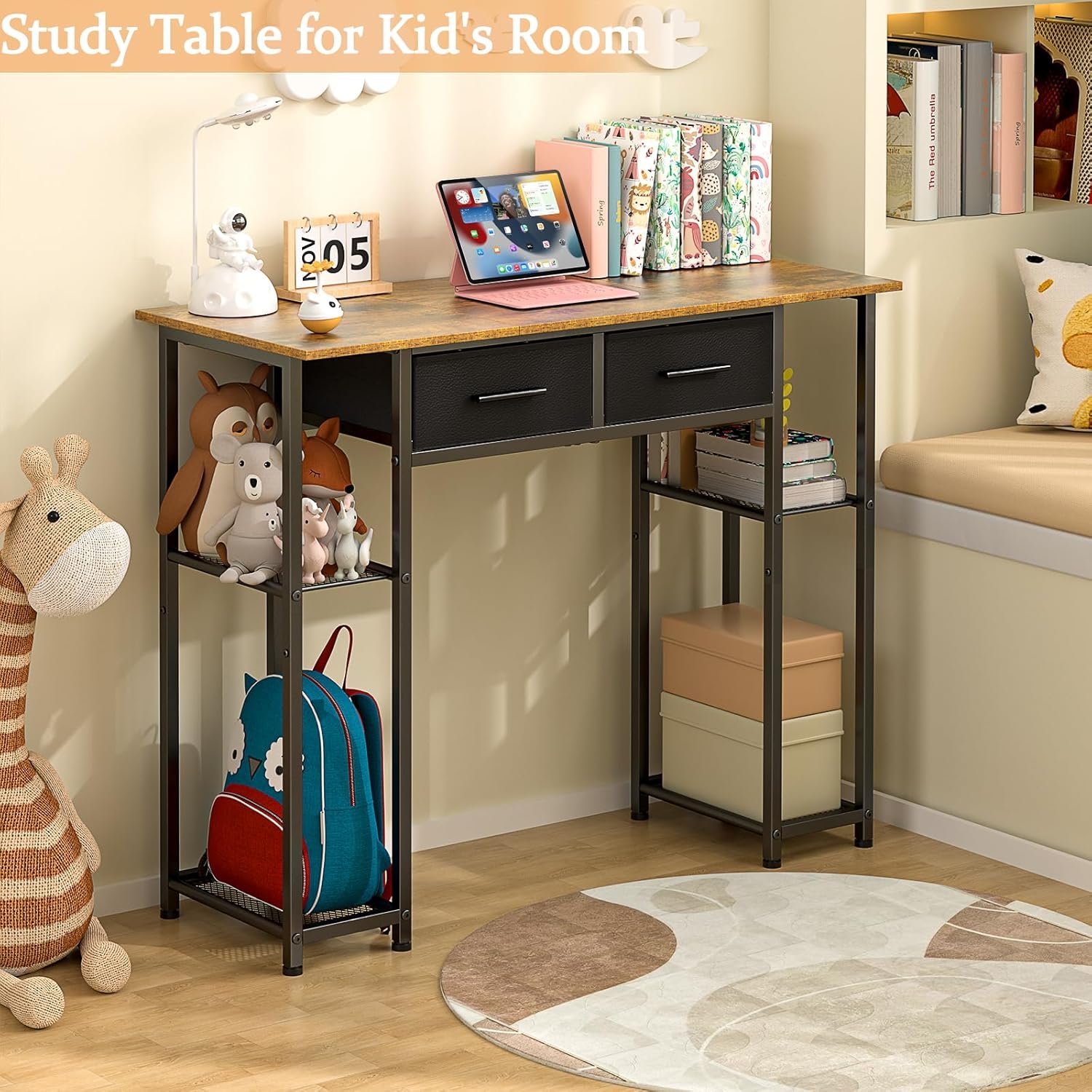 Computer Desk with Drawers, 37.3 Inch Home Office Work Desk with Storage Shelf, Kids Teens Study Table for Small Space, Small Writing PC Table for Bedroom Makeup Vanity Desk, Brown