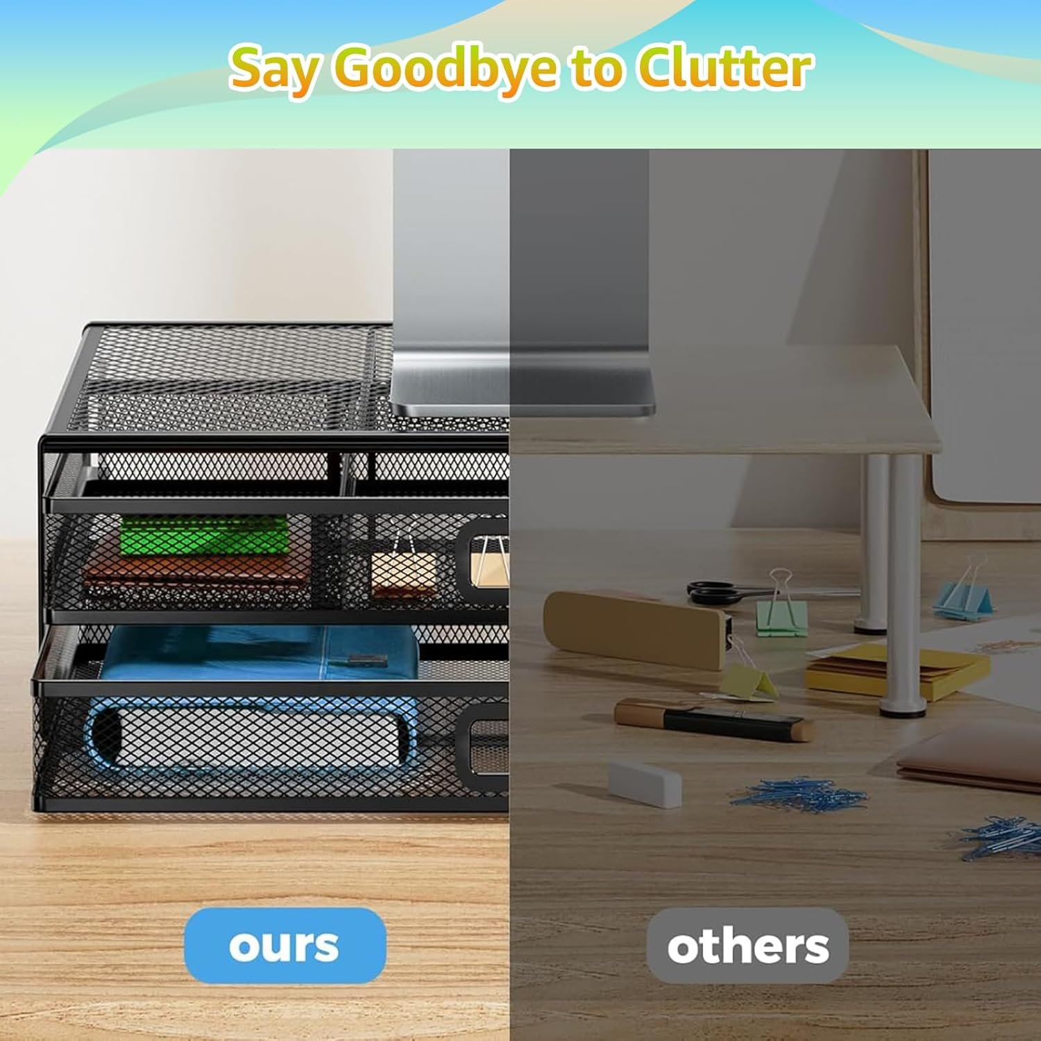 Computer Monitor Stands with Drawers, Metal Mesh Desktop Monitor Riser, Desk Storage Organizer with Drawers for PC, Laptop, Printer (Black)