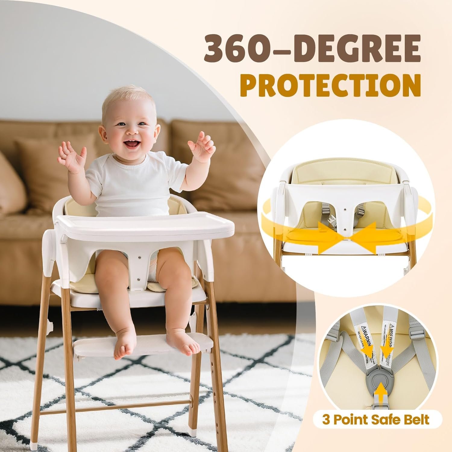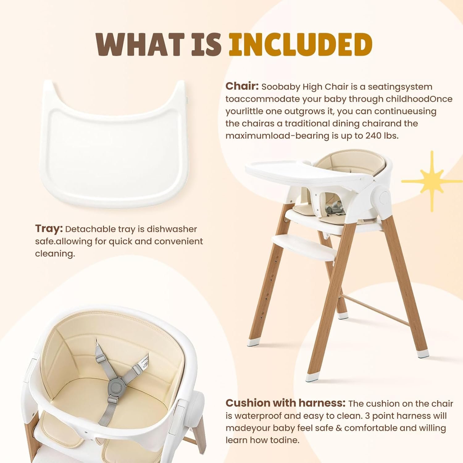 Grow with your child – Soobaby High Chair is a seating system to accommodate your baby through childhood. Once your little one outgrows it, remove the Baby food tray& baby set to continue using the chair as a traditional dining chair and the maximum load-bearing is up to 240 lbs.