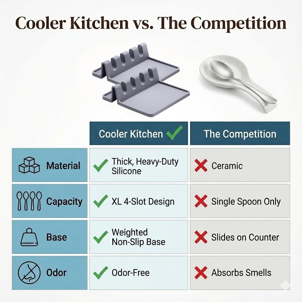 ENJOY A NICE & CLEAN COUNTERTOP: Start cooking like a pro with our universal silicone utensil rest! Maximize your counter space and minimize mess by keeping all your cooking or grilling utensils and kitchen gadgets neatly organized in your kitchen workspace. You will absolutely love cooking with a Cooler Kitchen silicone spoon holder! ROTATE TWO UTENSIL RESTS! The best part about having two is being able to swap one out for another when it gets dirty!