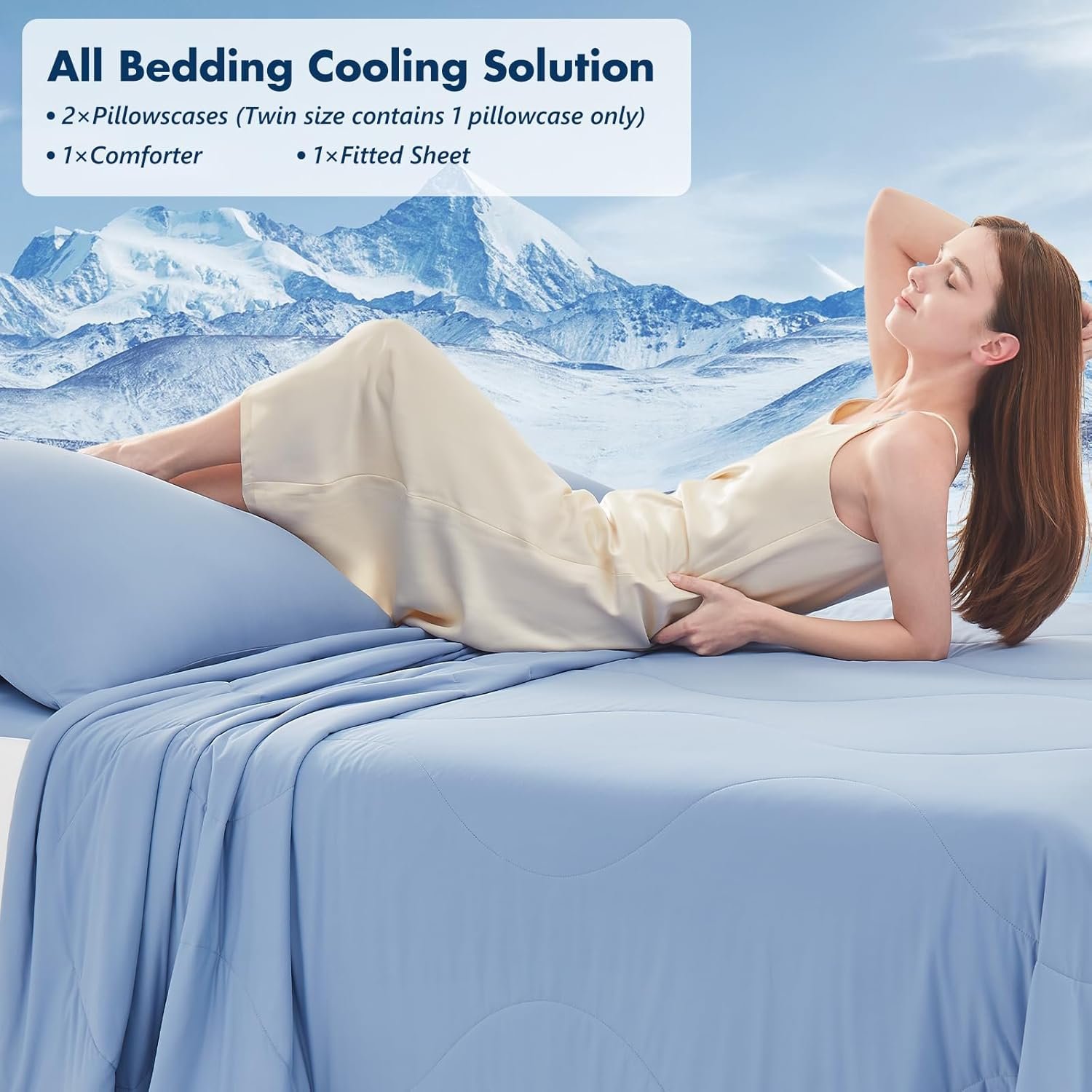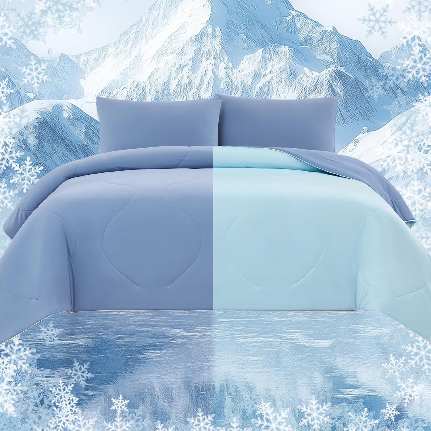 Cooling Comforter Set with Sheets&Pillowcase,Cooling Blanket for Hot Sleeper Cold ice Double Side Blue Bed Set Twin Size 3pcs(Comforter+Fitted Sheets+Pillowcase)