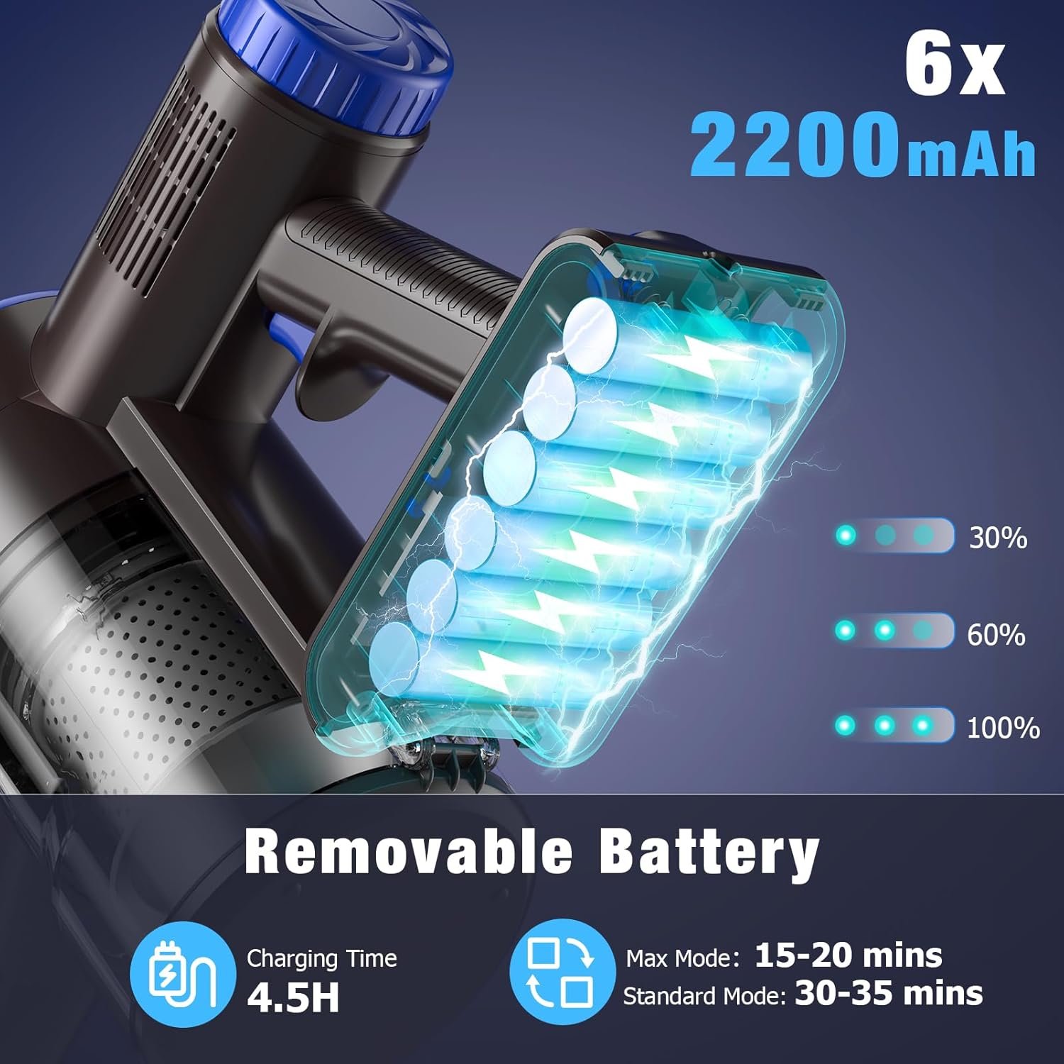 [Detachable Battery]The vacuum cordless is equipped with 6-cell 2200mAh removable battery, which achieves 4.5 hours fast charging and long lasting battery life. 15~20 mins in max mode and 30-35 mins in standard mode. You can charge the batteries pack, main machine charging or wall-mounted charging. [NOTE] Complete 2-3 cycles of fully charging and total depletion to activate and make it match with the main machine unit to get the optimal working hours. Make sure to charge before first use.