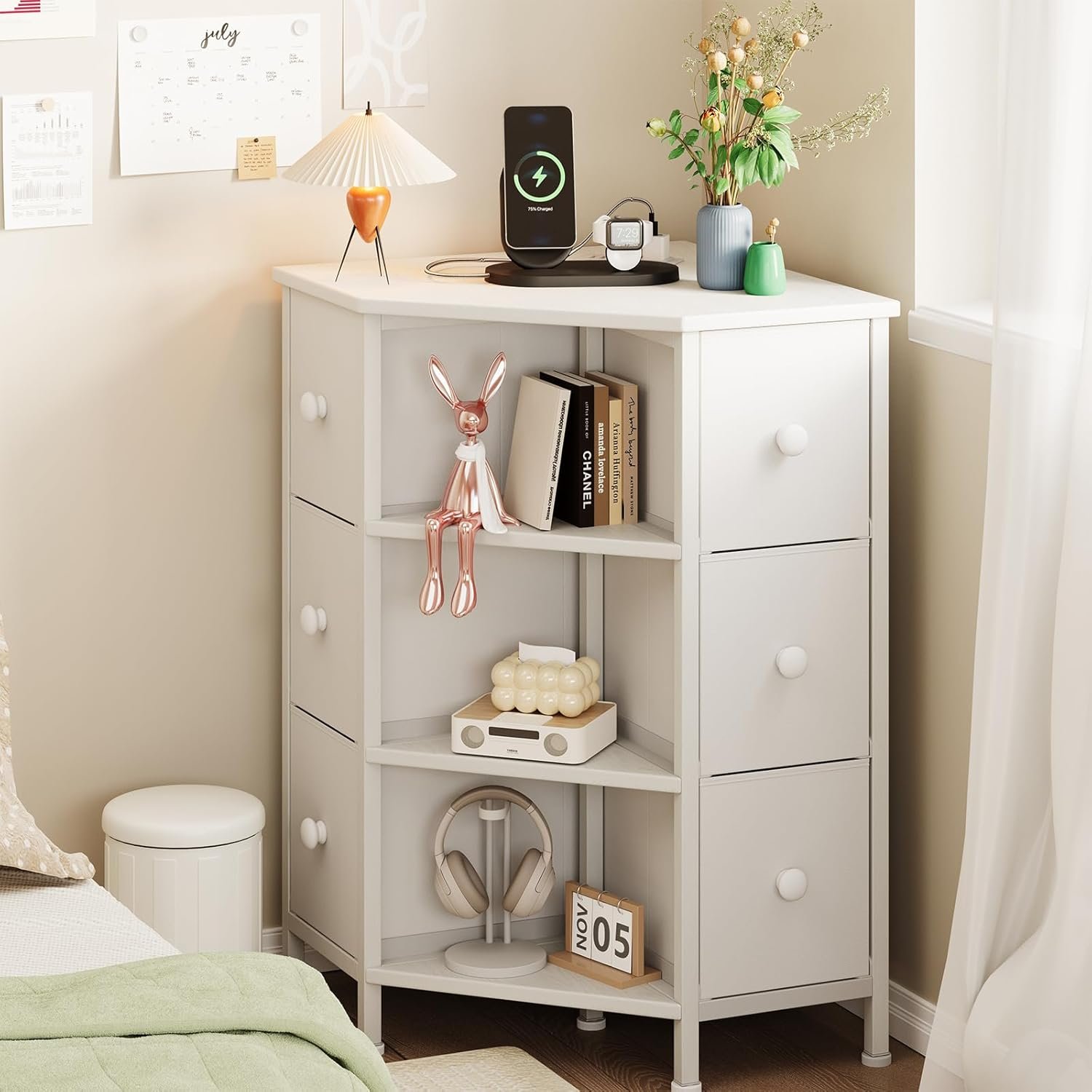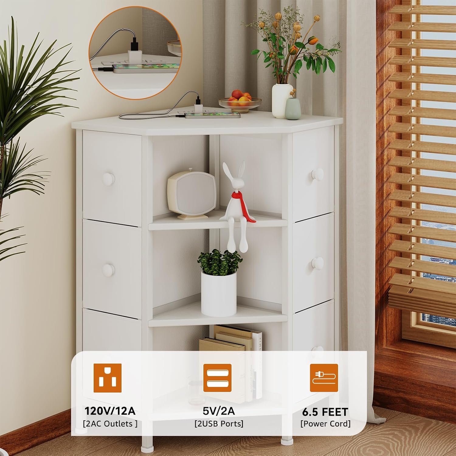 Corner Dresser, Corner Storage Cabinet Shelf with 6 Fabric Drawers Dresser & 3-Tier Open Shelves & Power Outlet, Modern Cubby Cube Organizer Bookshelf for Small Space