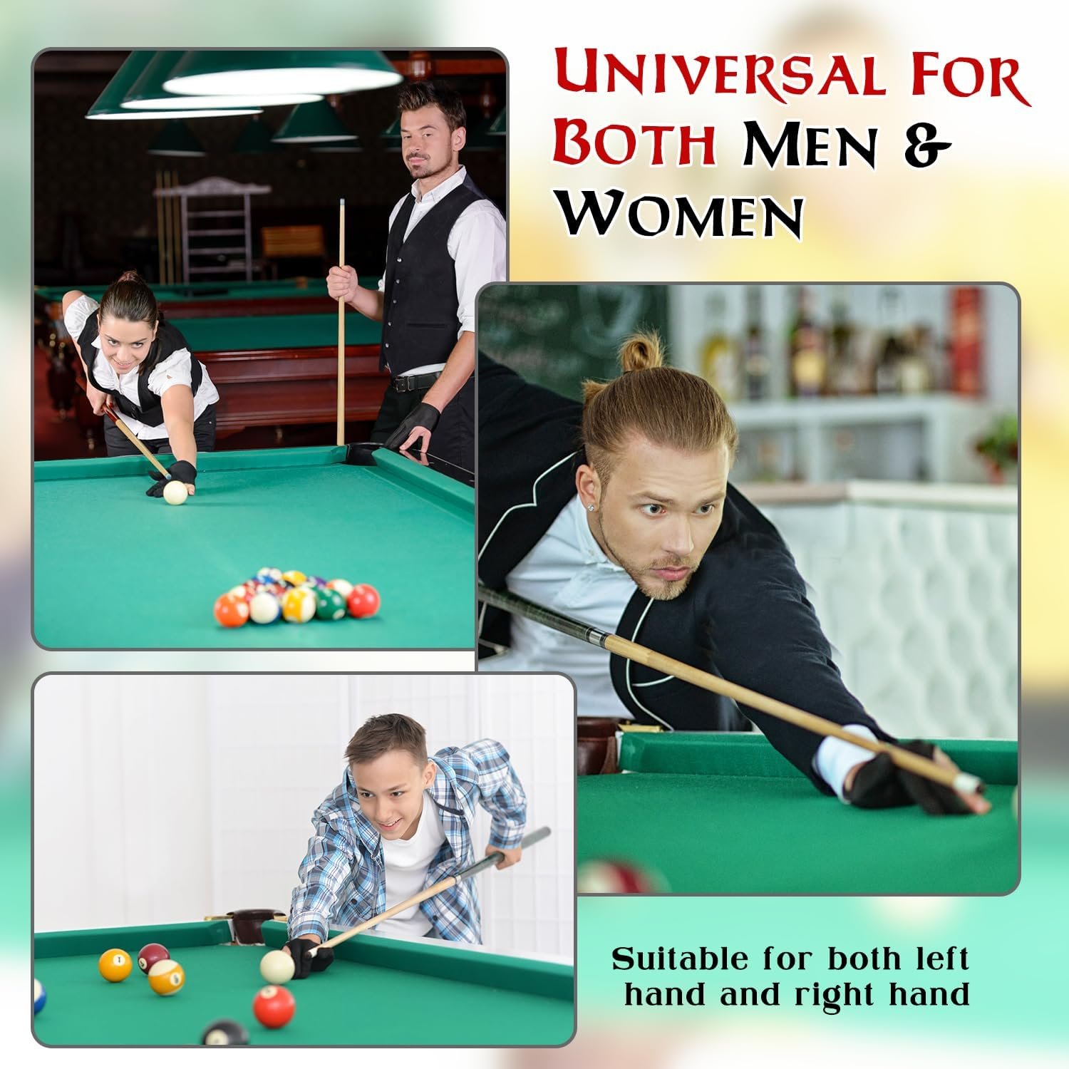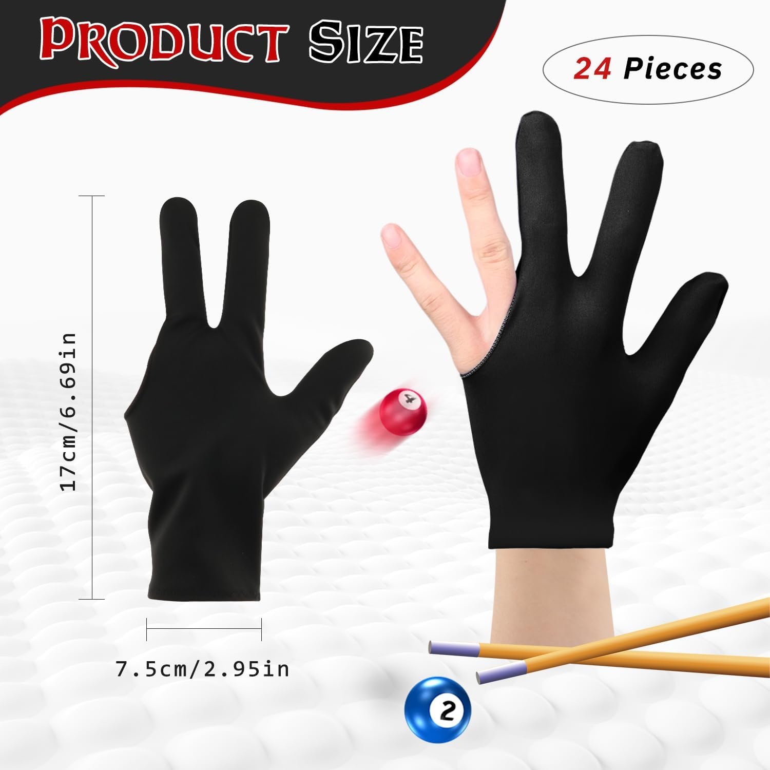 【Universal Size】Each three finger show billiard glove is measured approx. 17cm/6.69inches in length. Elastic and stretchable, suitable for most of hand for both men and women. Useful for both left-hand and right-hand.