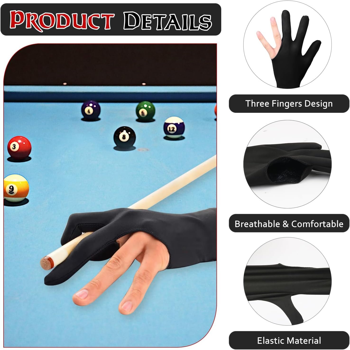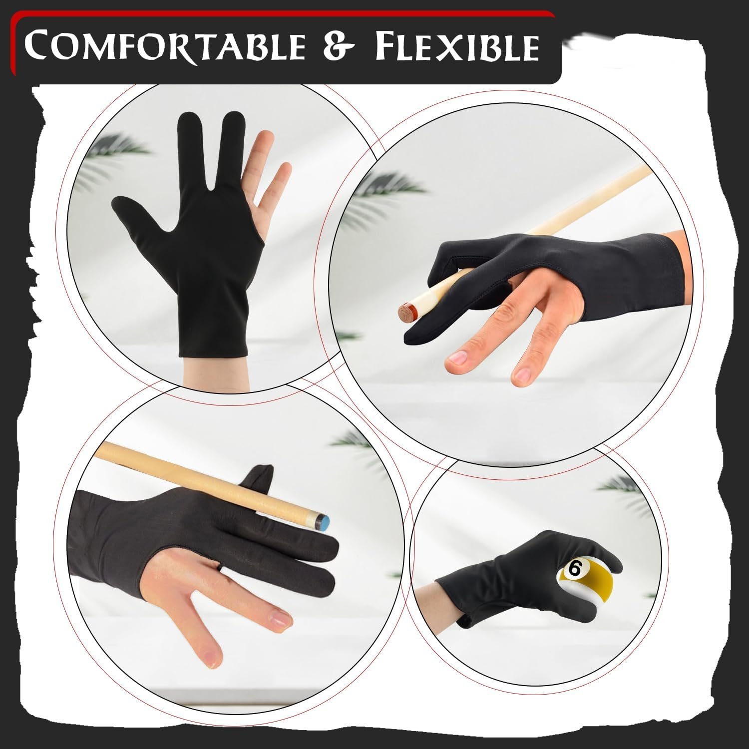 【Premium Material】Our billiard cue gloves are made of high quality polyester material, stretchy, flexible and form fitting. Breathable, absorb sweat, lightweight, comfortable to wear. With smooth surface, not easy to wrinkle.