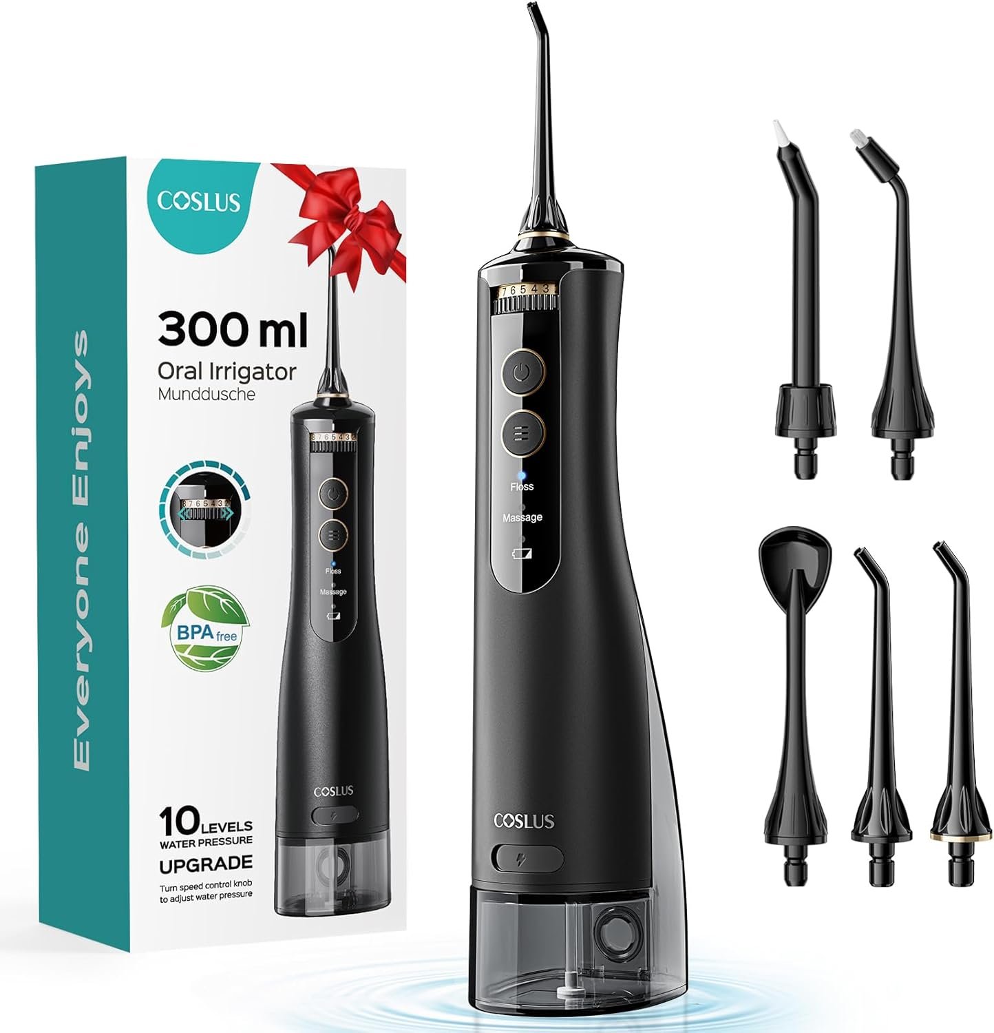 COSLUS Cordless Water Flosser & Dental Pick for Teeth, Braces, Gums Care – Advanced 10 Pressure Settings for Multiple Users, Rechargeable, Portable for Travel, BPA-Free, Black, E40(WFP14)