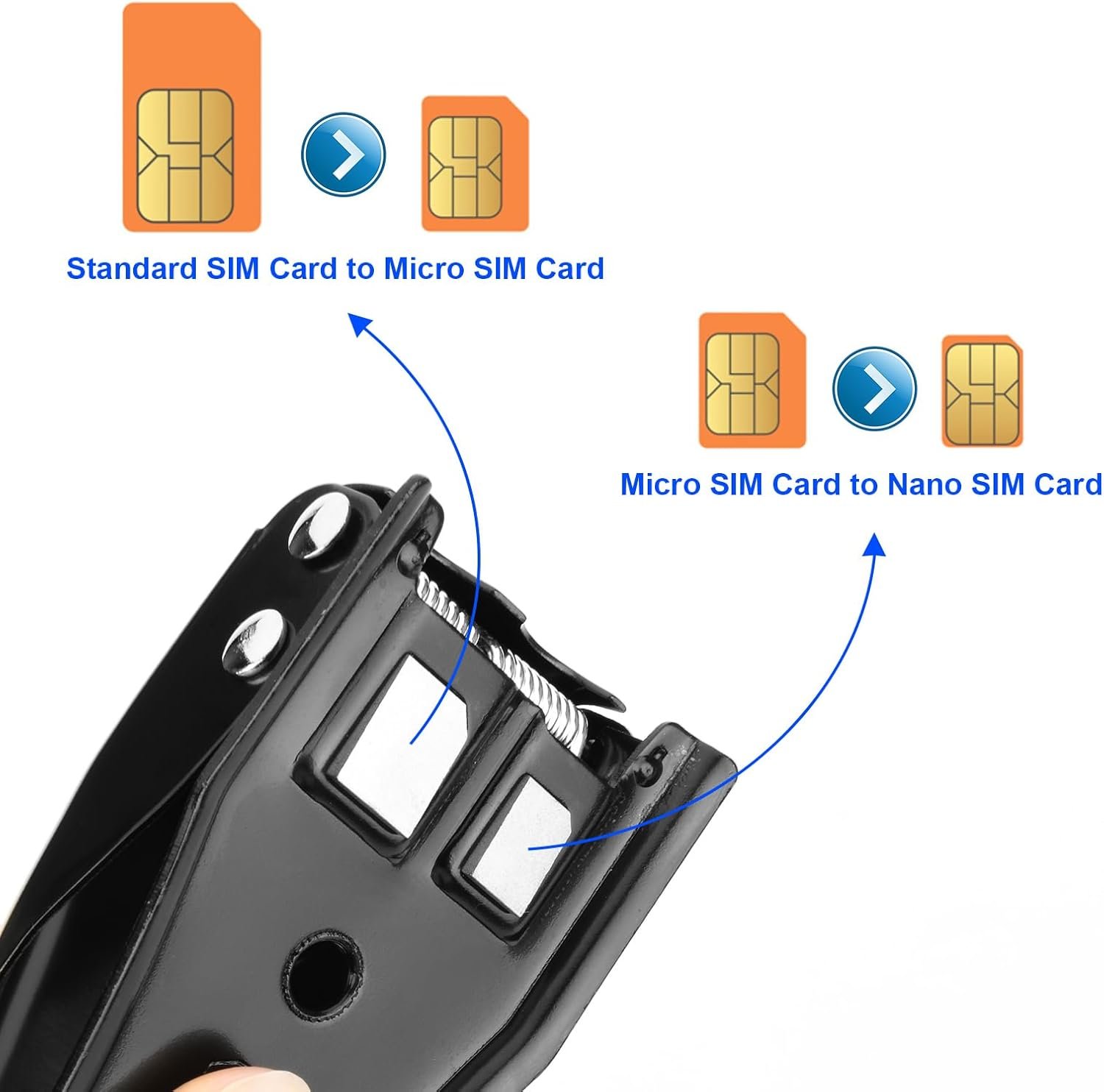 The dimension of the SIM card cutter is approx. 4.75″ x 2.2″ x 2″. Please see the instruction on printed package box and product page image for reference before using. Please check your sim card sizes before purchase.