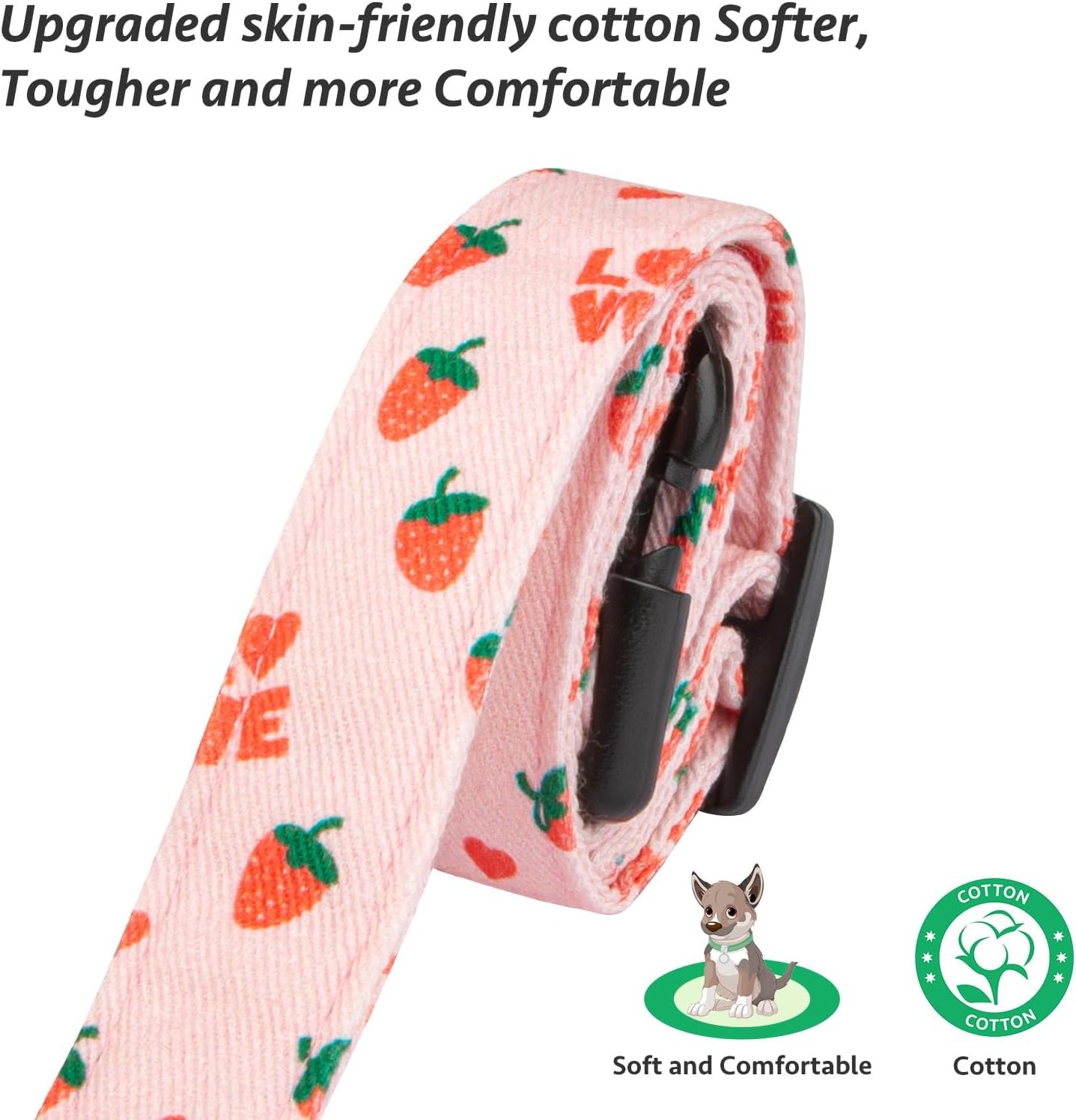 The dog collar,made of double cotton, is considered the optimal choice due to its high quality and non-irritating properties. It is designed to provide comfort for dogs of all sizes with adjustable lengths ranging from 9 ~ 13.7 inches (small), 11.5 ~ 17.5 inches (medium), and 13.5 ~21 inches (large). The widths are available in 0.6(S), 0.8(M), and 1(L) inch.