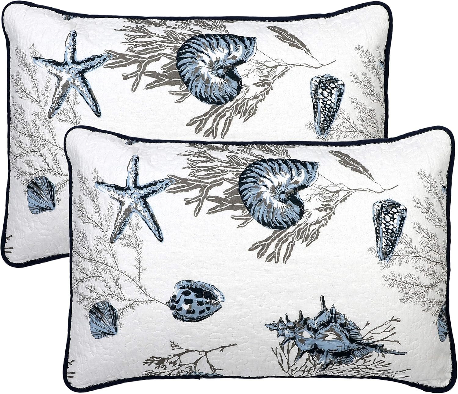 Cotton Quilted Pillow Cases Standard Size Set of 2, Queen Size Beach Themed Soft Comfy Pillow Shams, Pillow Covers with Tie Closure 20 x 27 inch (Cowry Starfish)