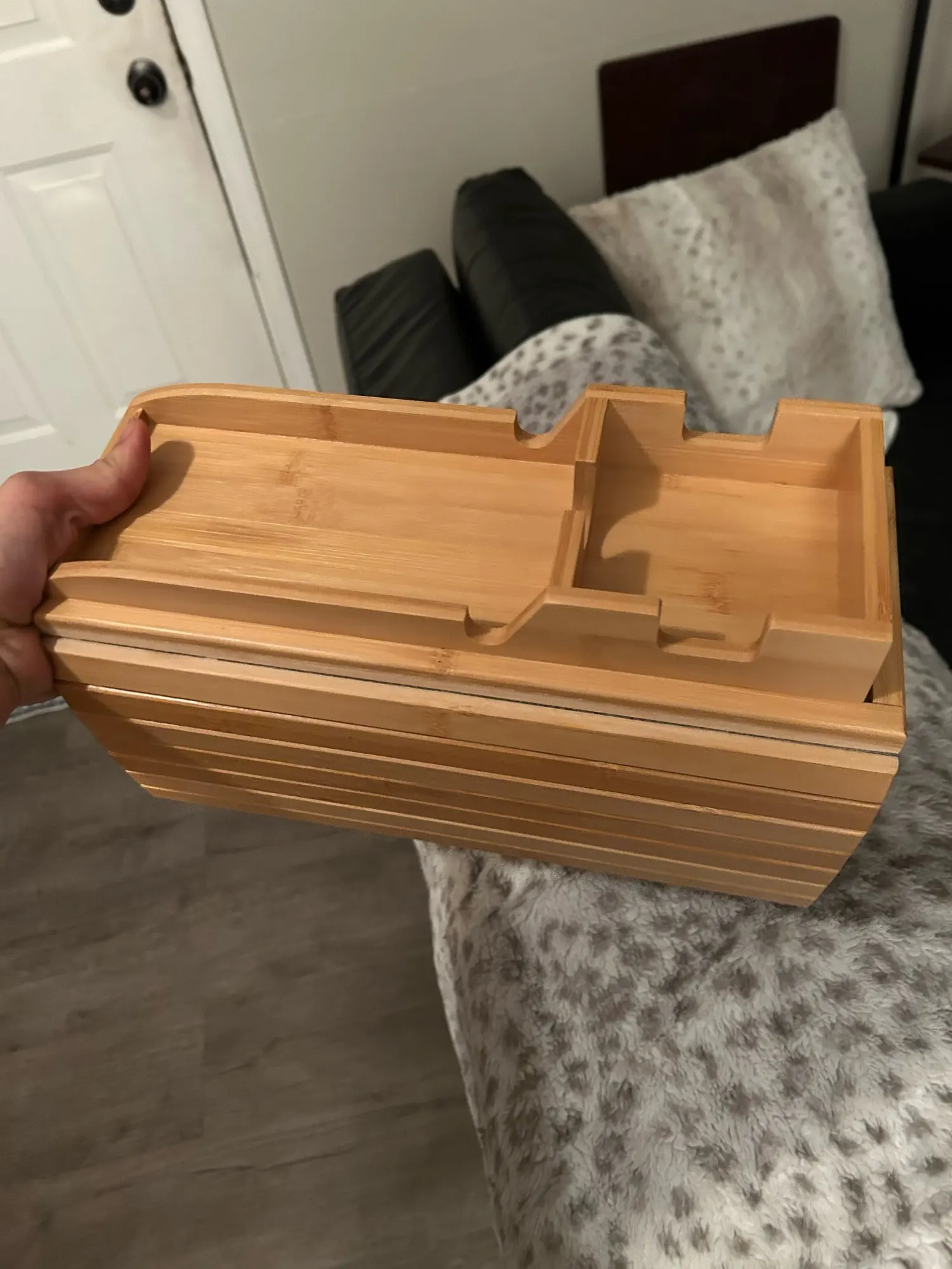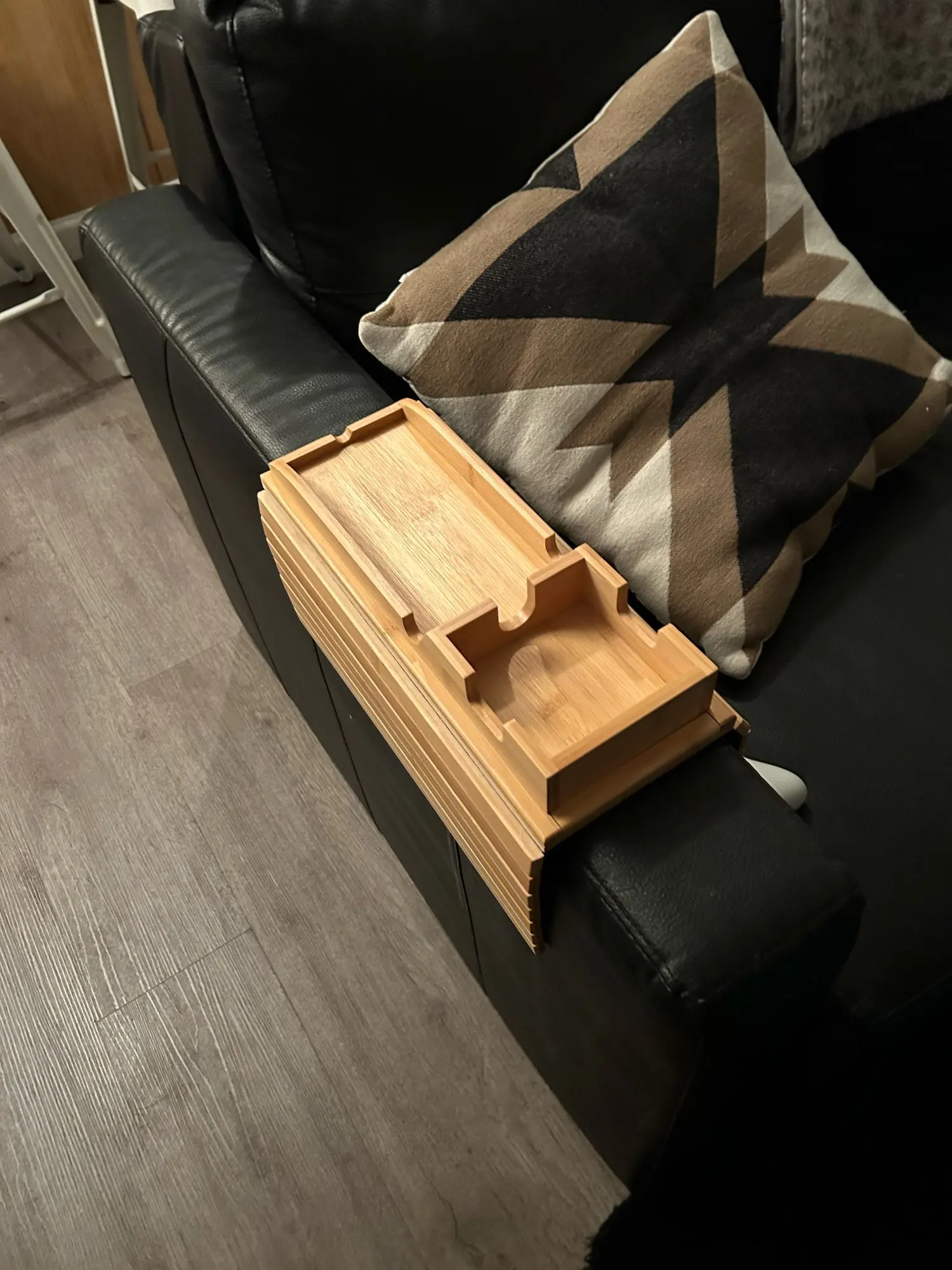 Very good quality, couch, cupholder, bamboo, wood sofa, arm rest tray that is foldable. Very high-quality wood, bamboo quality is authentic and not imitation word recycled wood. Product is very convenient for couches and nonslip surfaces are good for leather couches or slippery surfaces. I would highly recommend and i think i’m going to purchase two more. Easy inconvenient no need for a table on the side of the couch just please cupholder on armrests which is versatile because you’re gonna have a mug or a cup as well as place phone or other items.