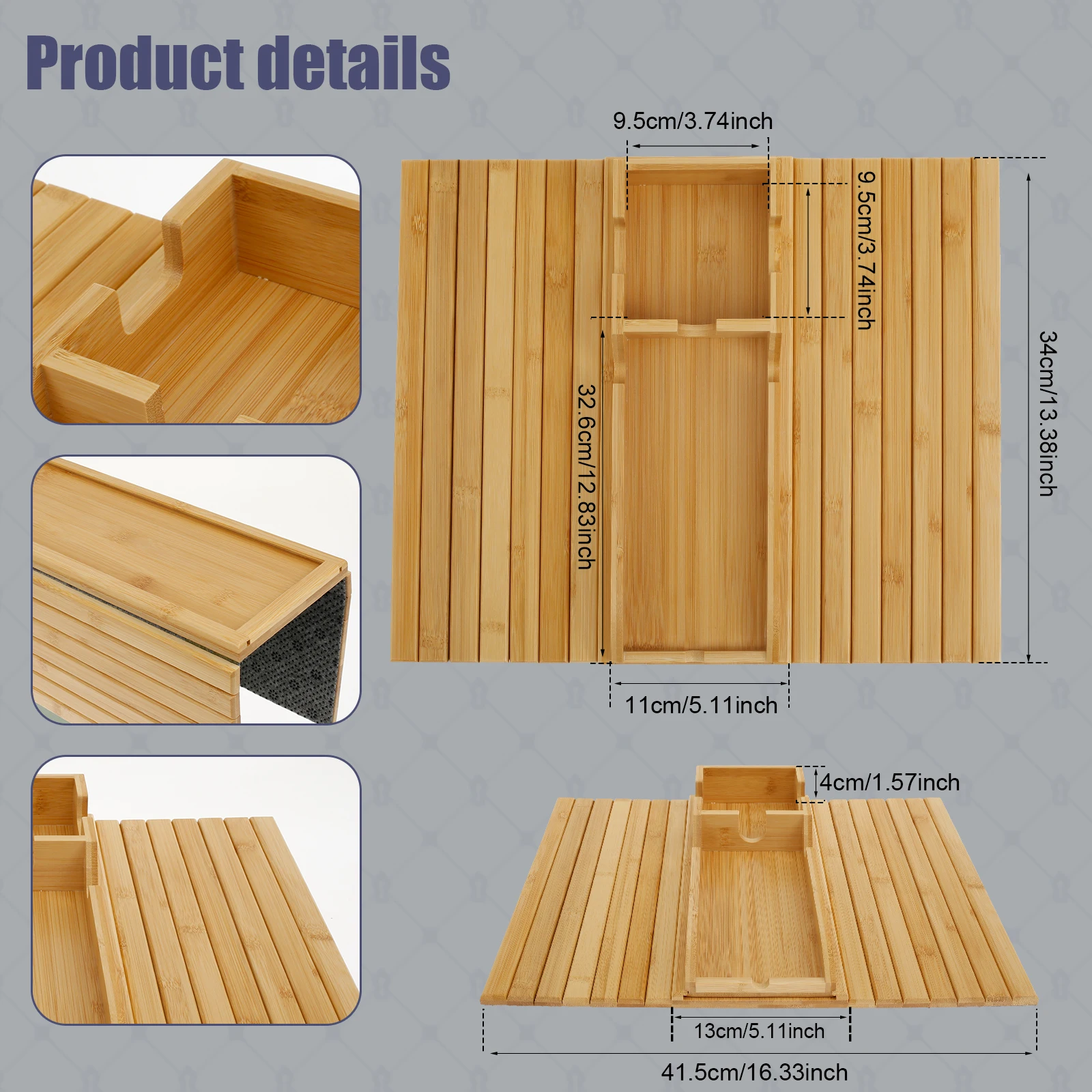 The 2 side panels of this sofa cup holder tray are designed as foldable strips, every 2 adjacent wooden strips are foldable between each other, to fit different width sofa armrests, widely applicable to most sofas, suitable for wide armchairs, recliners, rolled chairs and straight arms.